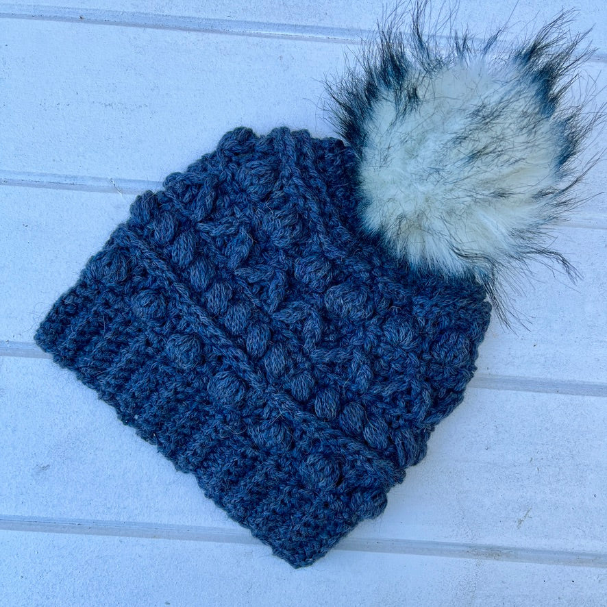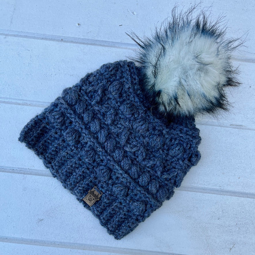 The Fable Beanie features funky textured stitching and is topped with a fluffy faux fur pompom