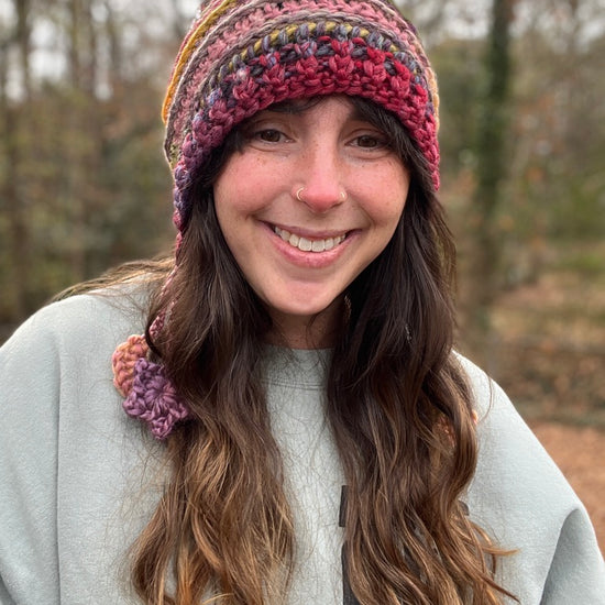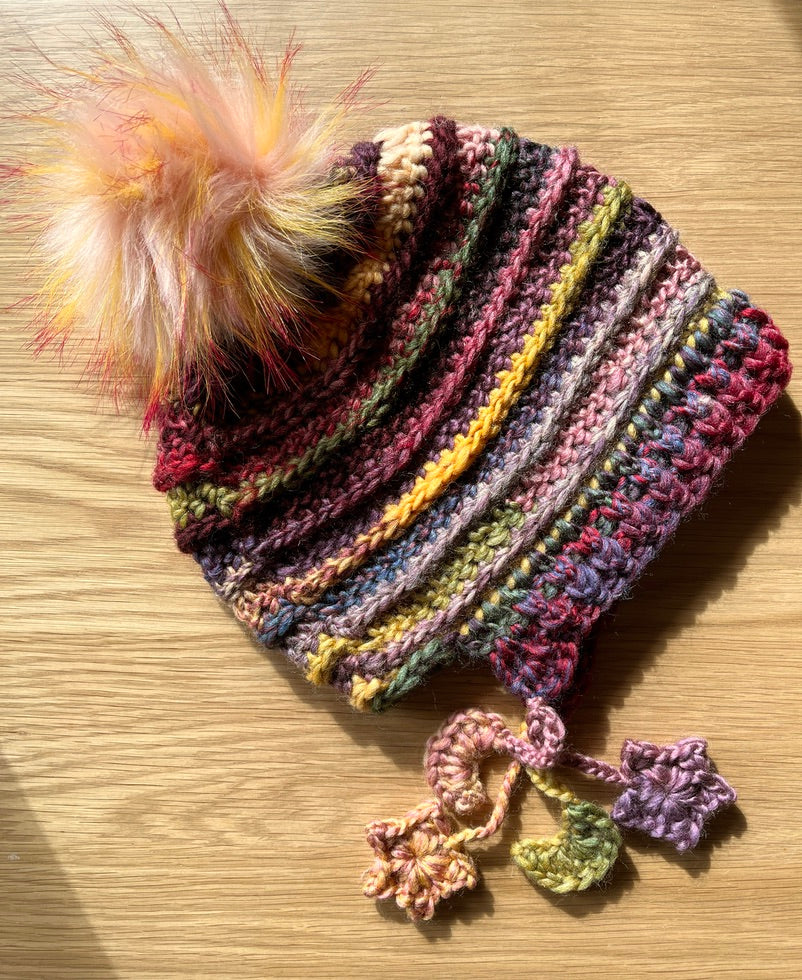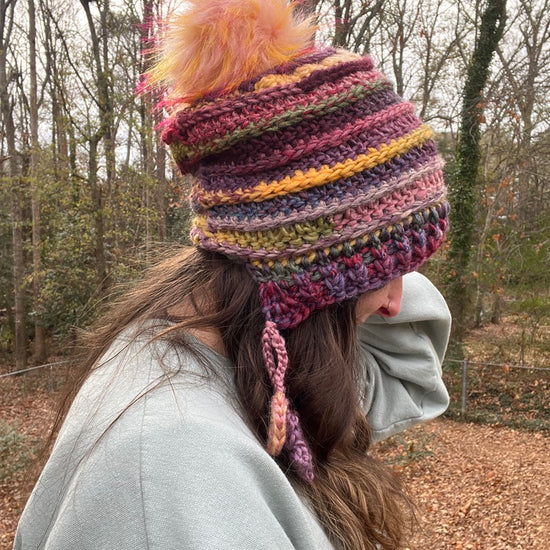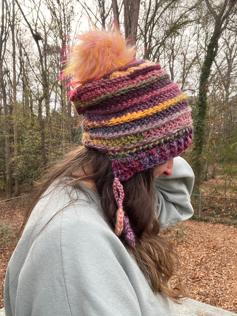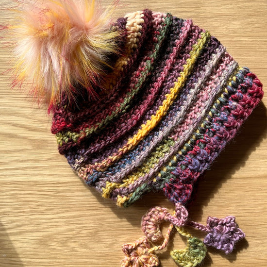 The Slouchy Bonnet features simple, subtle texture and fun little tassels. It is topped with a fluffy faux fur pompom that attaches with a snap for easy removal