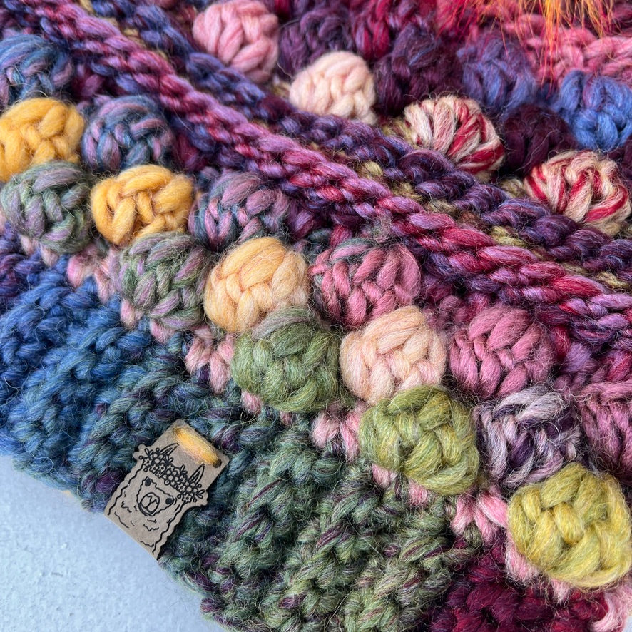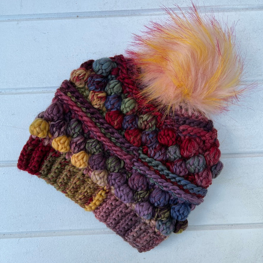 The Wobble Bobble Beanie features funky textured stitching and is topped with fluffy faux fur pompoms. Each of my hats is one of a kind