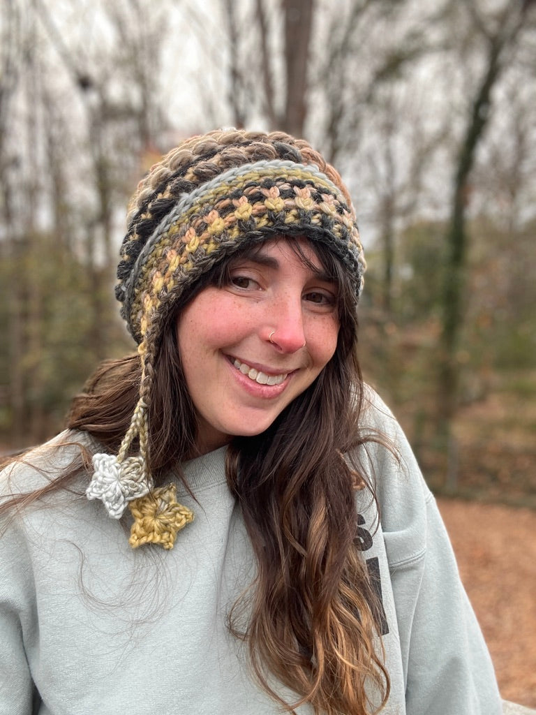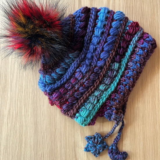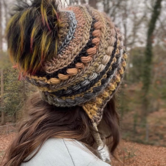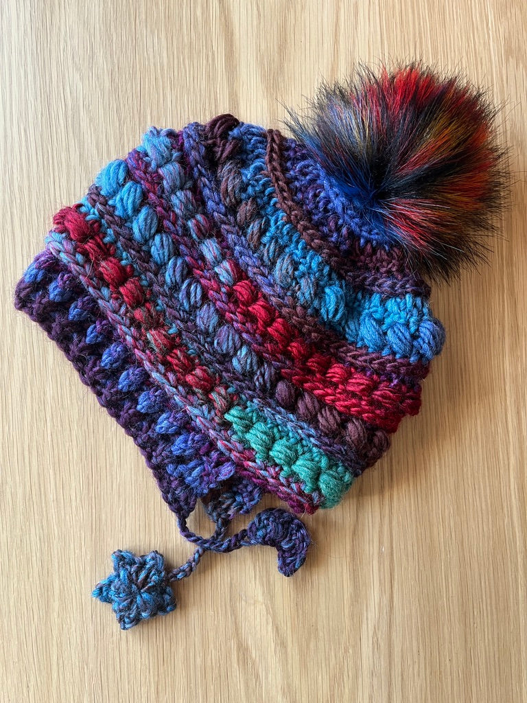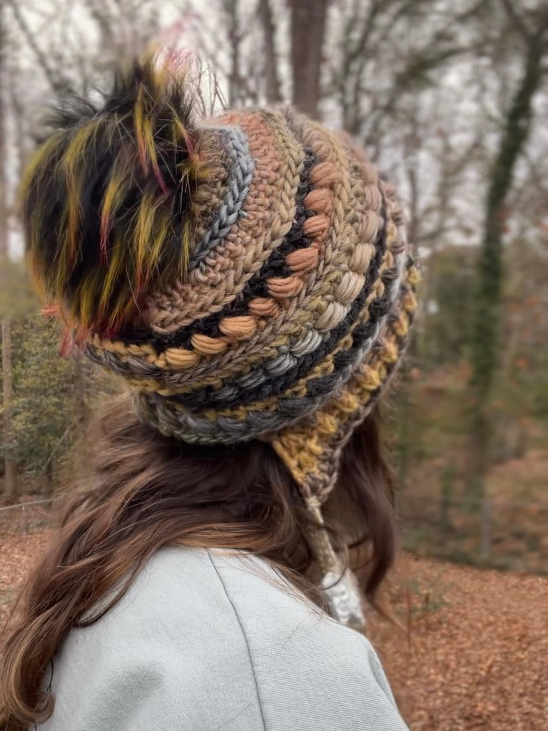 It has a relaxed fit and fun little tassels. It is topped with a fluffy faux fur pompom that attaches with a snap for easy removal