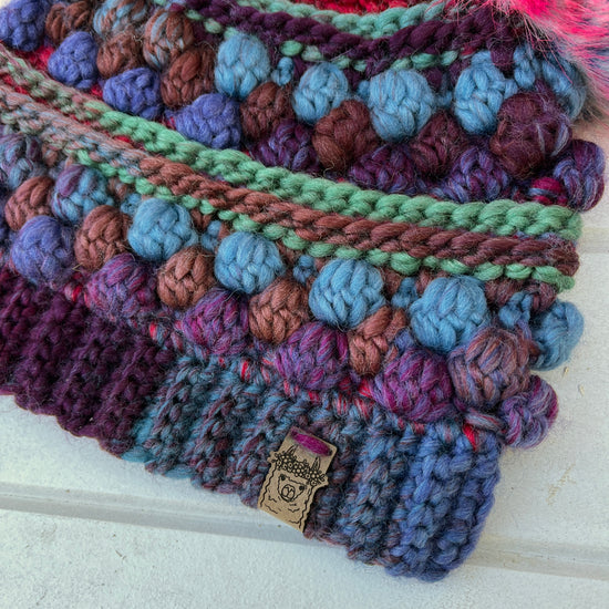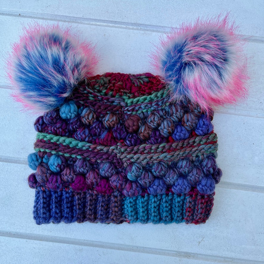 The Wobble Bobble Beanie features funky textured stitching and is topped with fluffy faux fur pompoms. Each of my hats is one of a kind