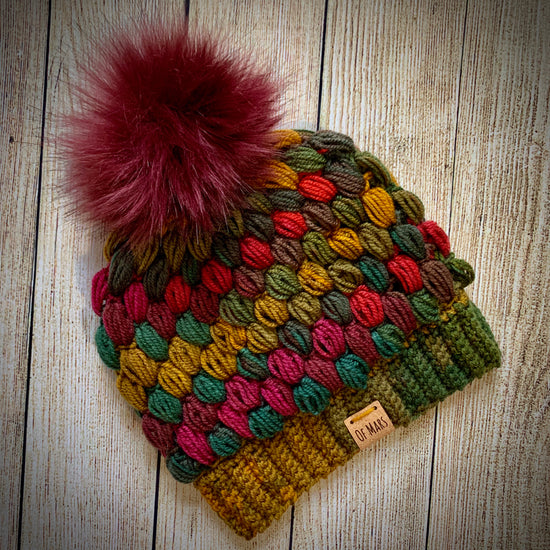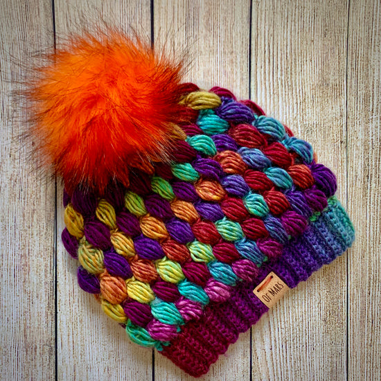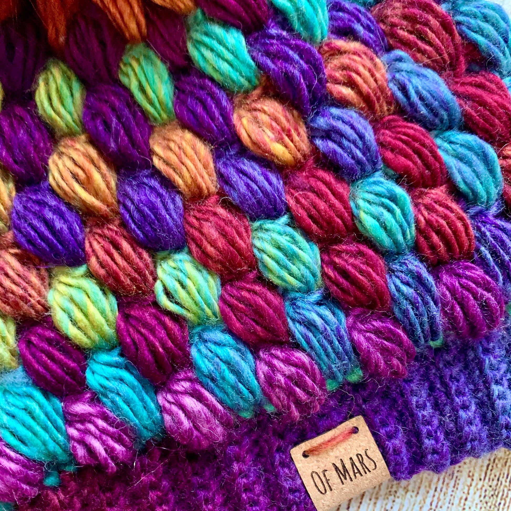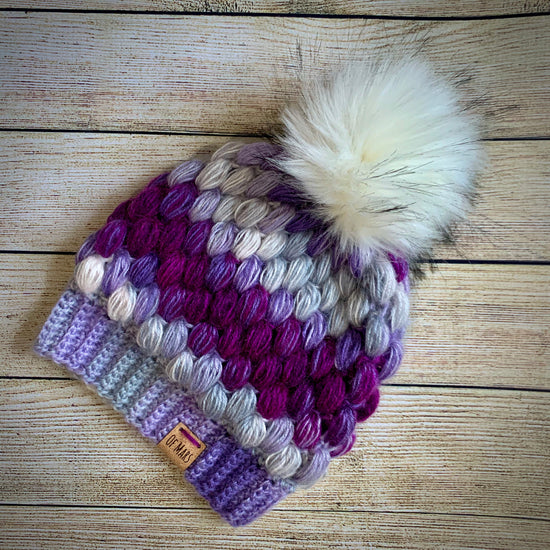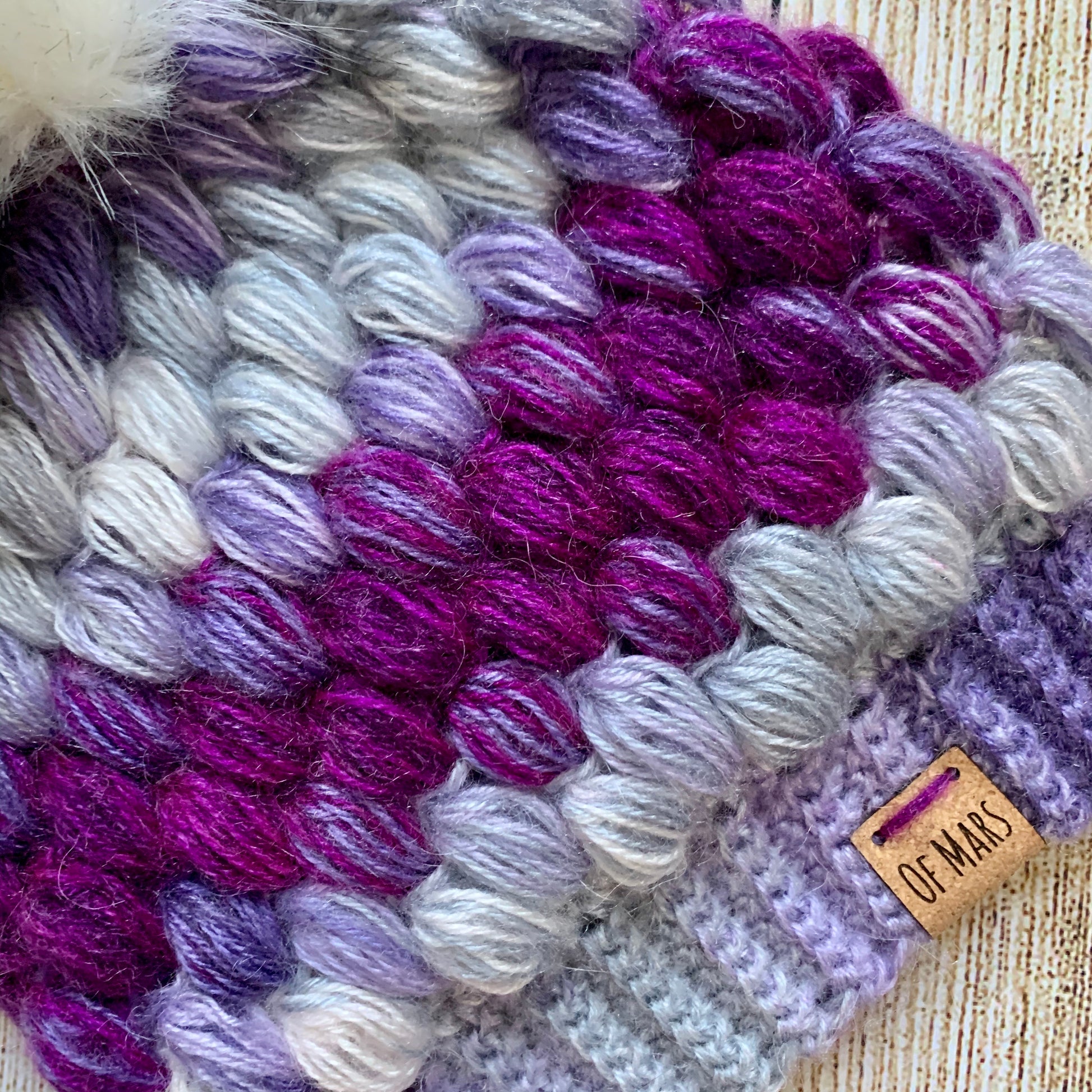 It features stacked puff stitches that are squishy and lush, creating a warm textured hat. It has a ribbed band and looks great with a big fluffy pompom!