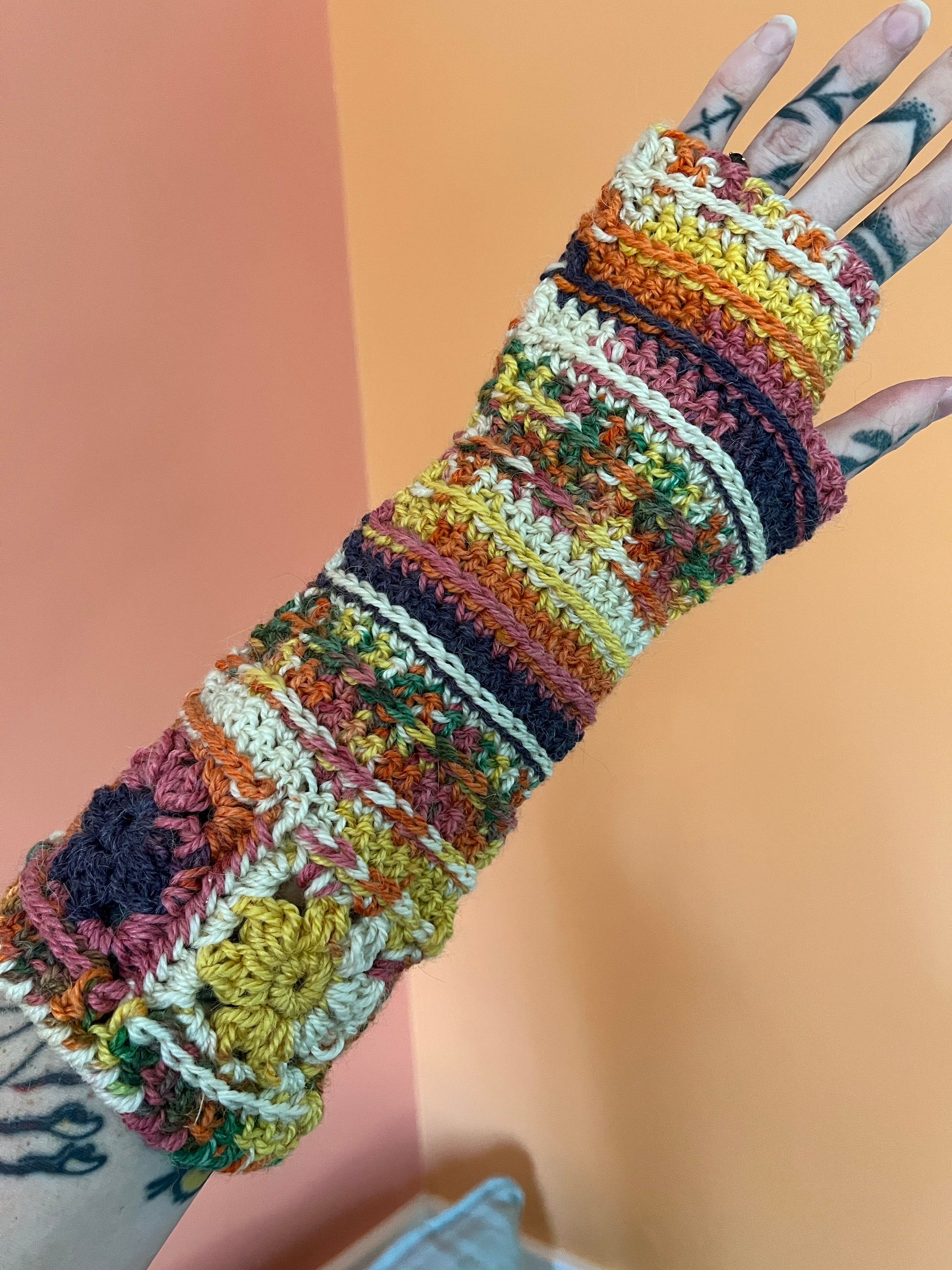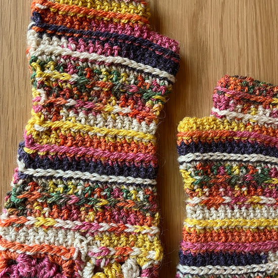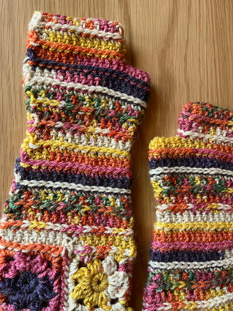 The Daydreamer Gloves feature a fancy flower cuff and textured stripes with shaping throughout the wrist and hand.