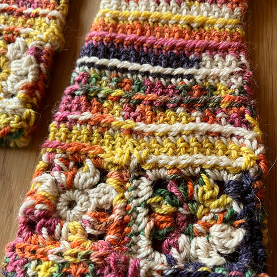 made from a wool, alpaca, and acrylic blend yarn
