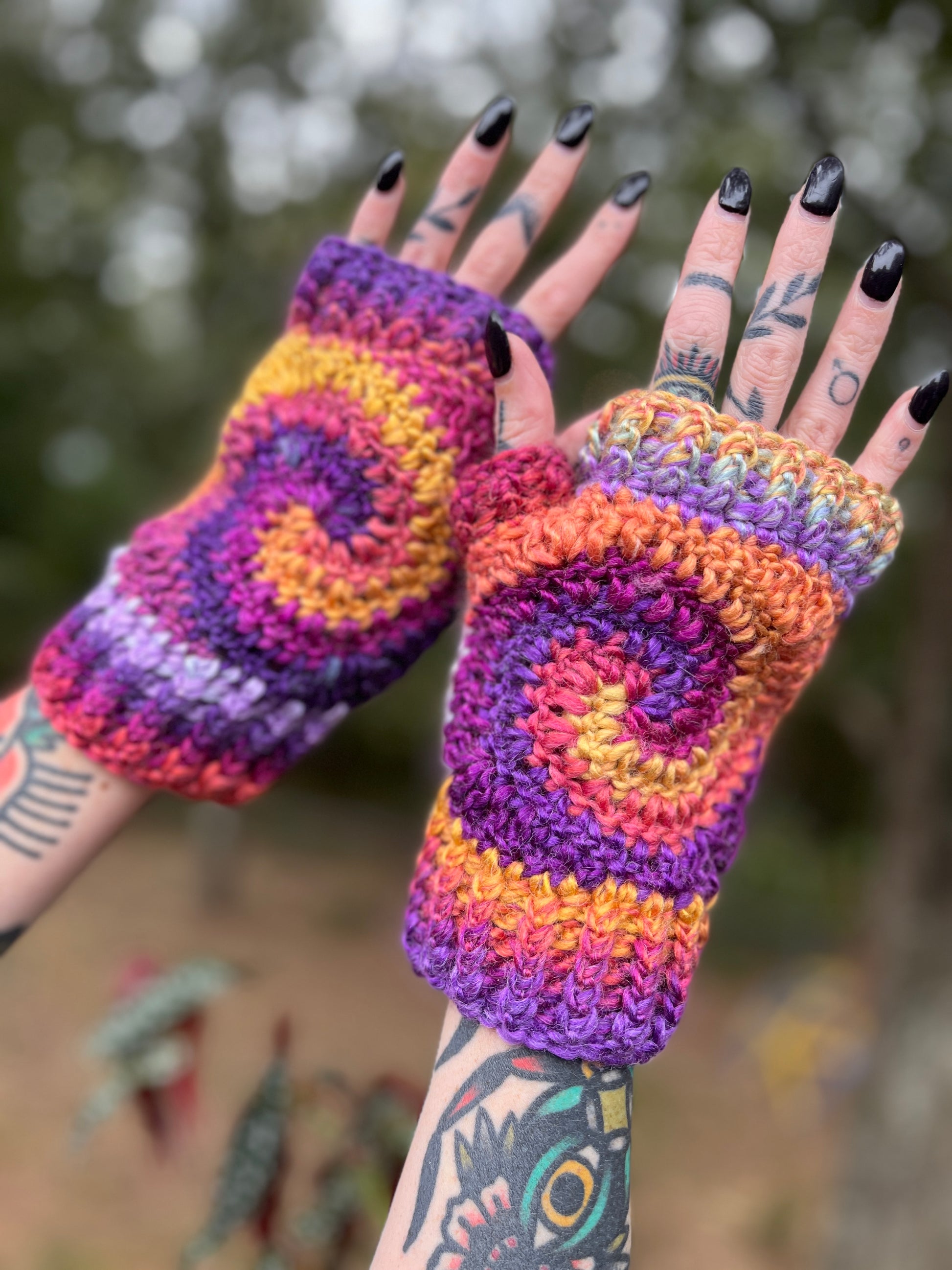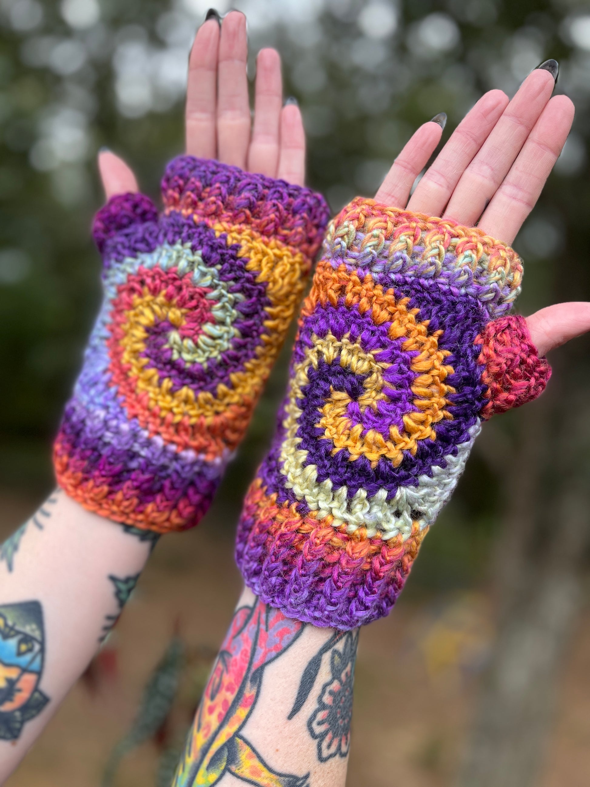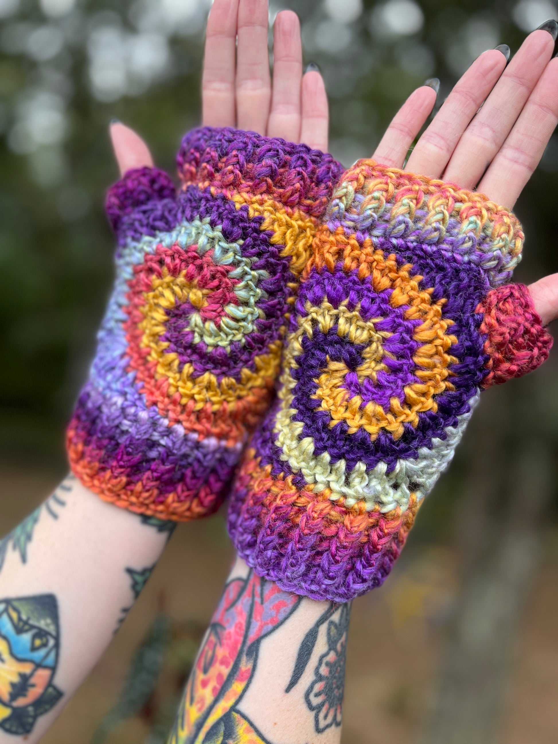The Swirly Fingerless Gloves feature a swirl design on both sides of the gloves and ribbed detailing.