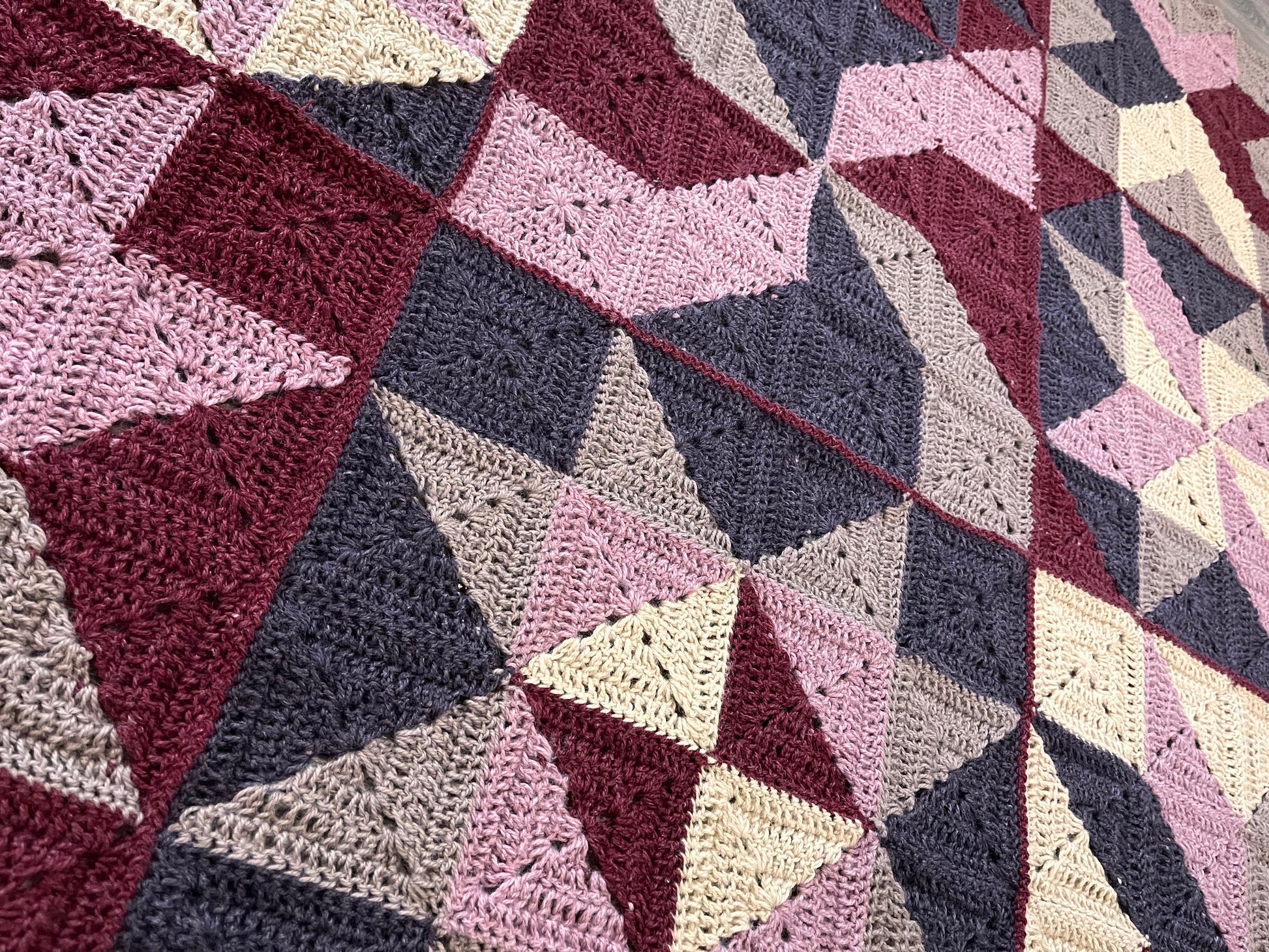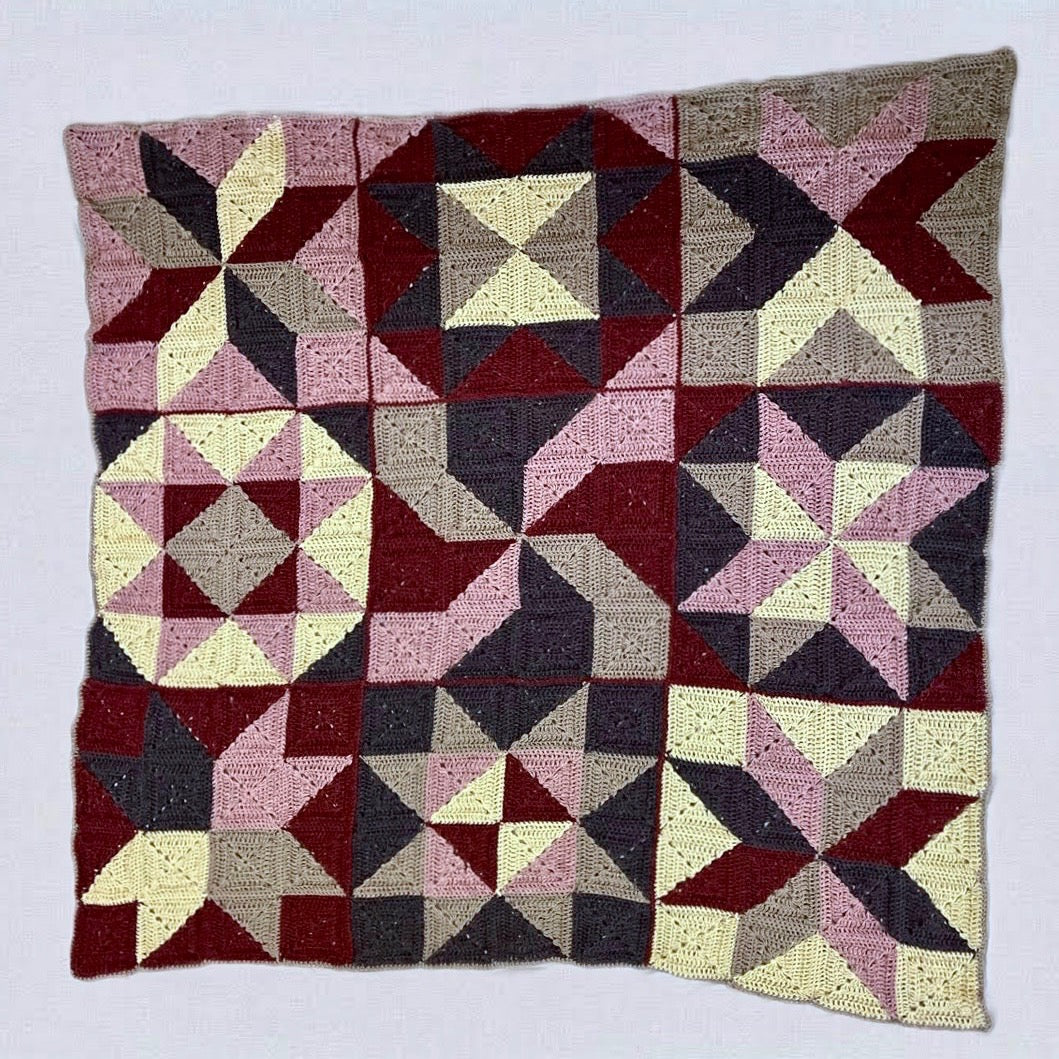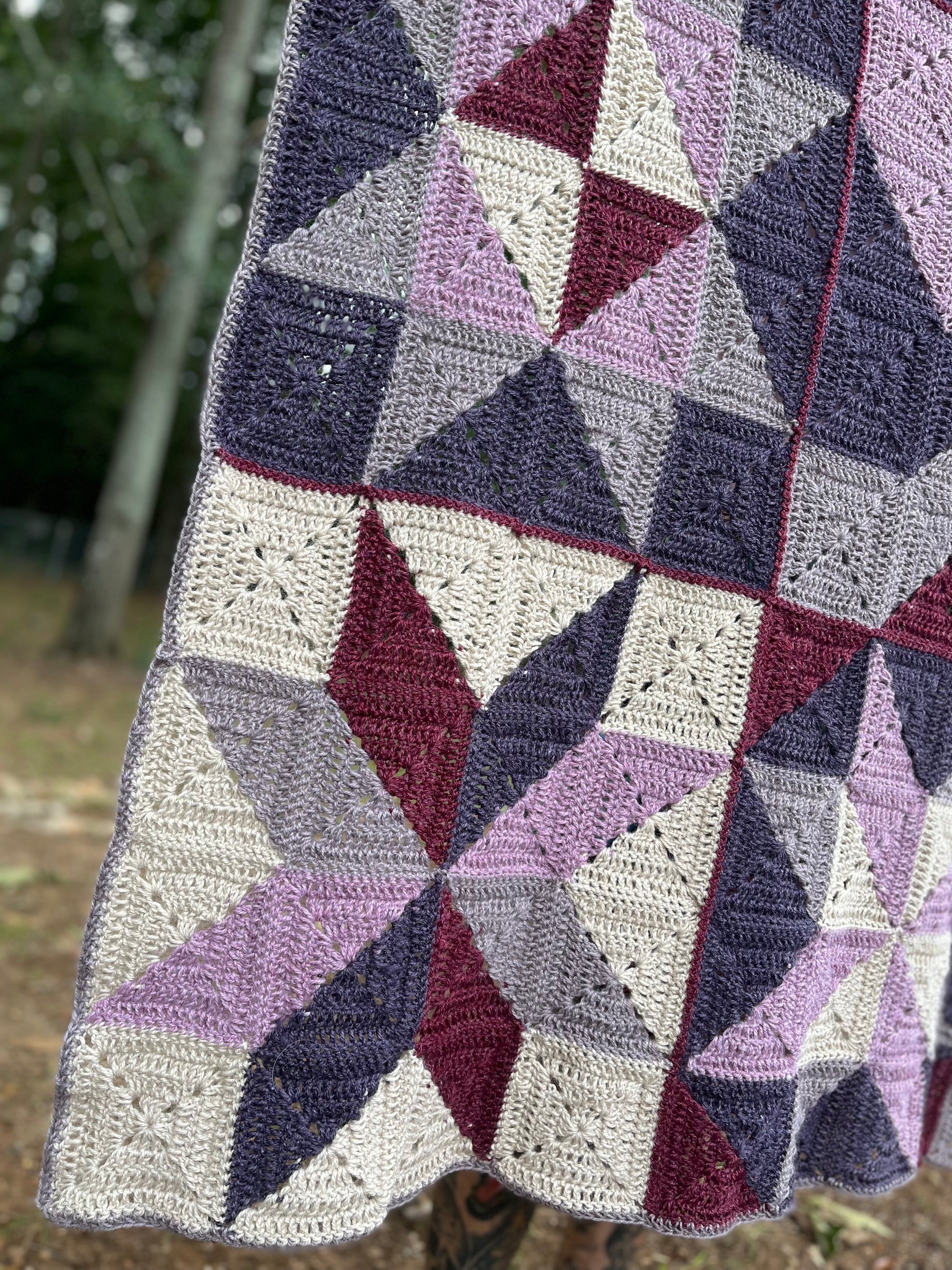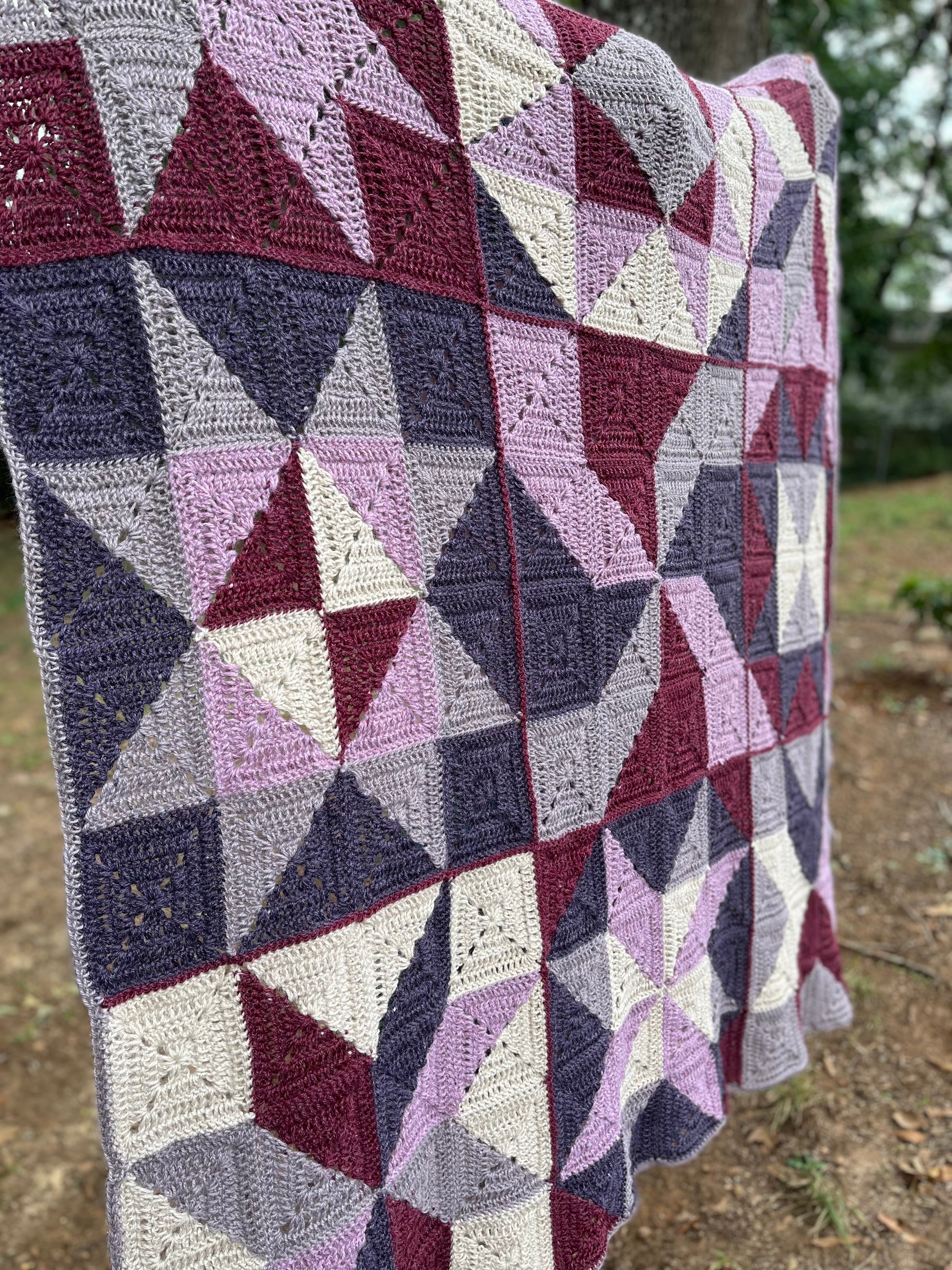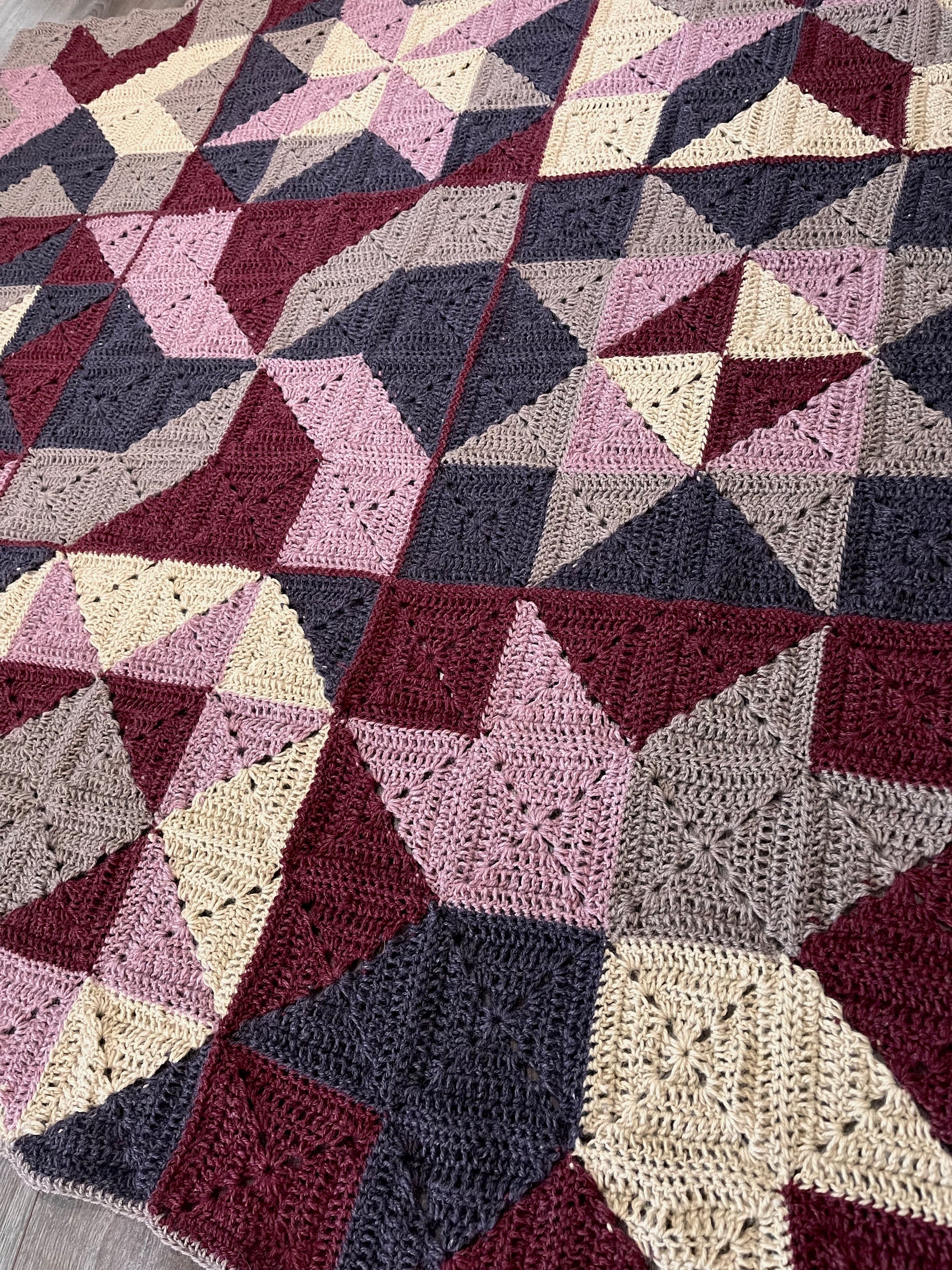 Materials: 5 mm hook, 5 skeins Lion Brand Respun (100% recycled polyester, 10 oz / 658 yards) in colors Raisin, Parchment, Blush, Hazelwood, and Wine.