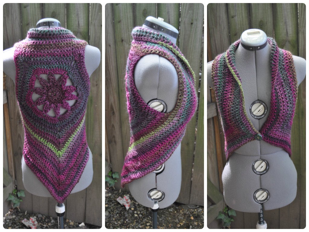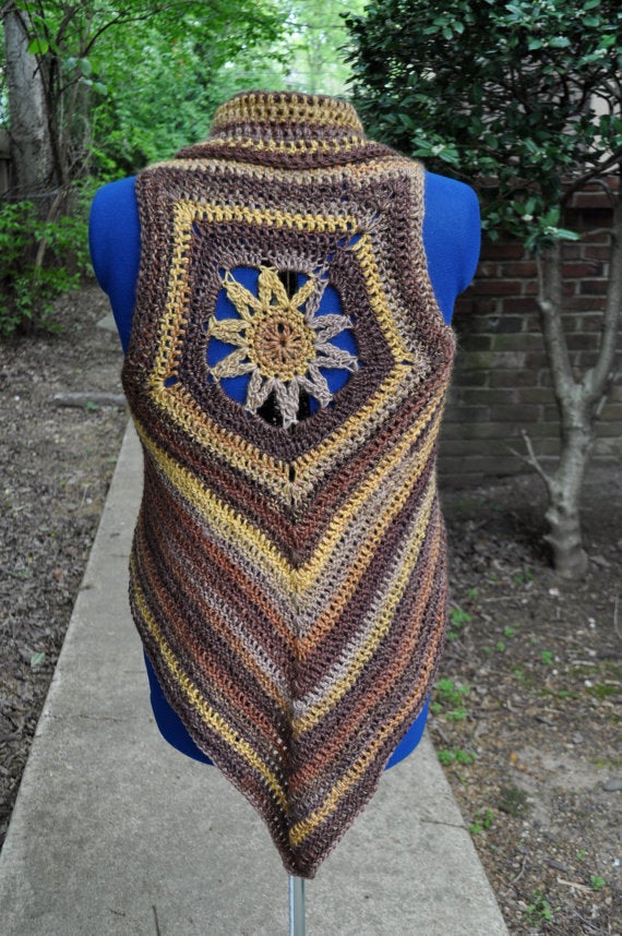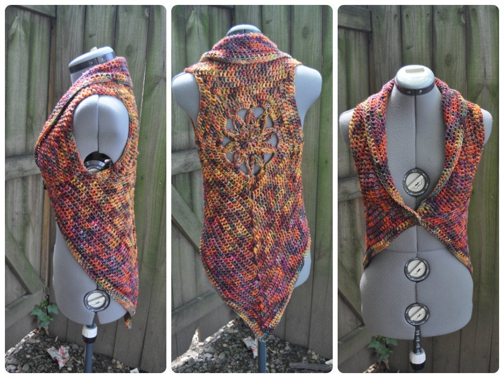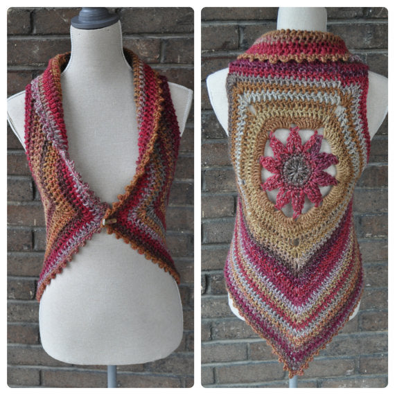 This vest features a flower mandala on the back, pixie point edging, button front, and rolled collar. These vests are super flattering to your curves and look great over pretty much anything.