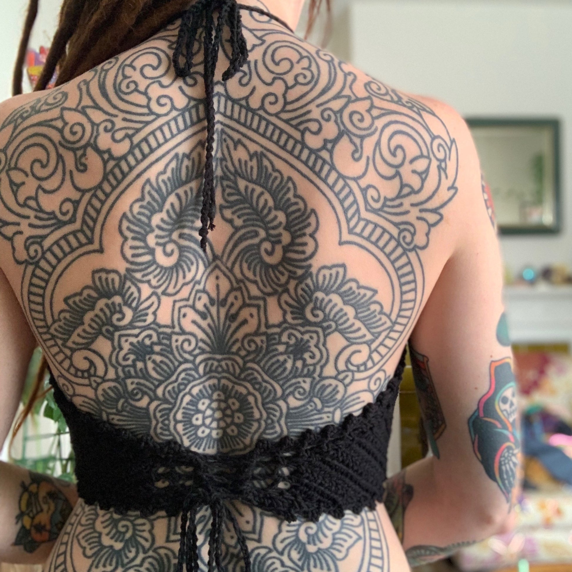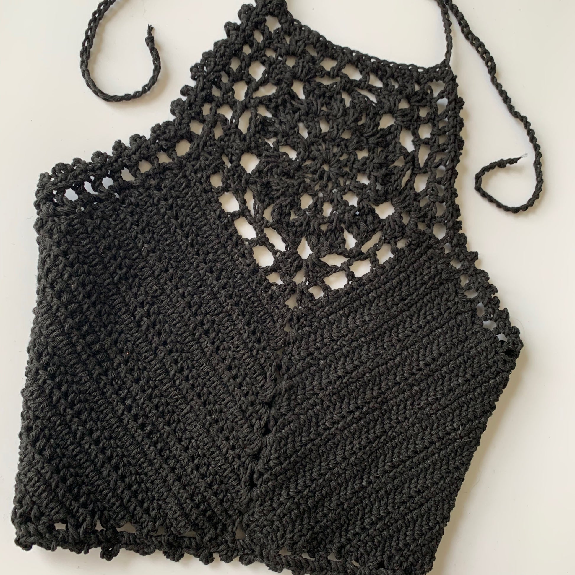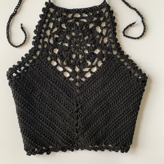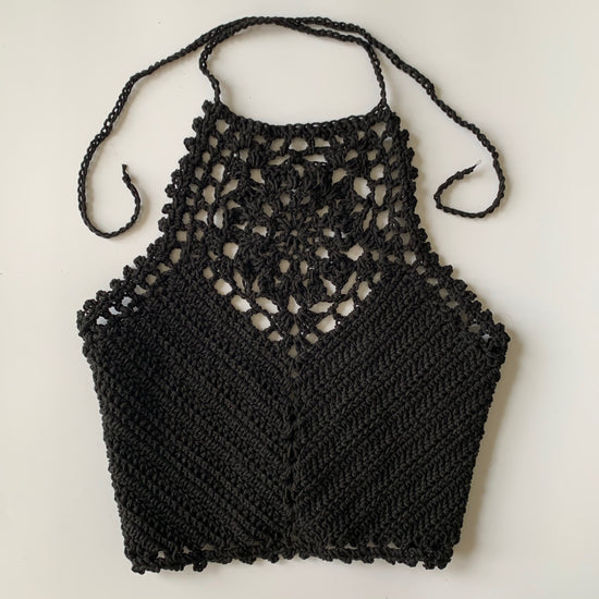 It features a blossom design at the neckline, cropped fit, and a lacy picot edging. The top ties at the neck using crochet ties and laces up the back