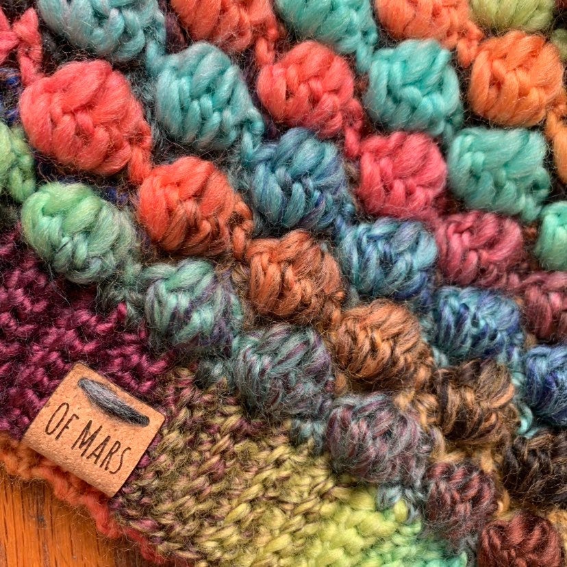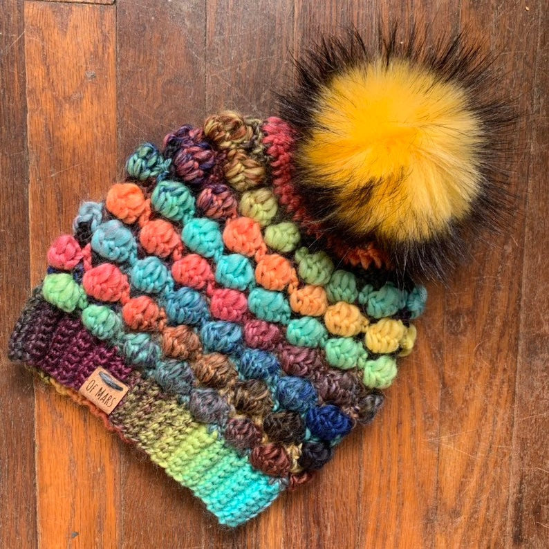 Stack Hat features rows of stacked bobbles with a "v" stitch in between the rows for a little breathability while staying warm and cozy! It has thick bobbles and a ribbed band. It looks great with a big fluffy pompom! The detailed stitches make the hat thick, warm, and squishy!