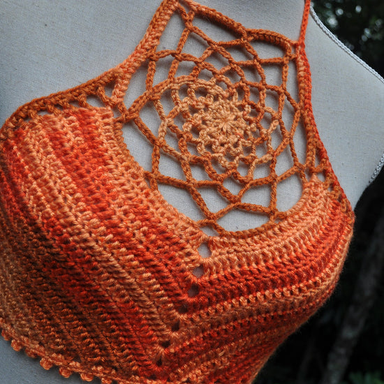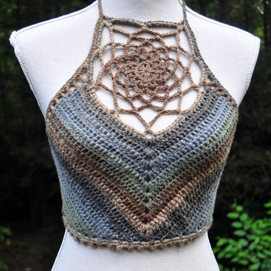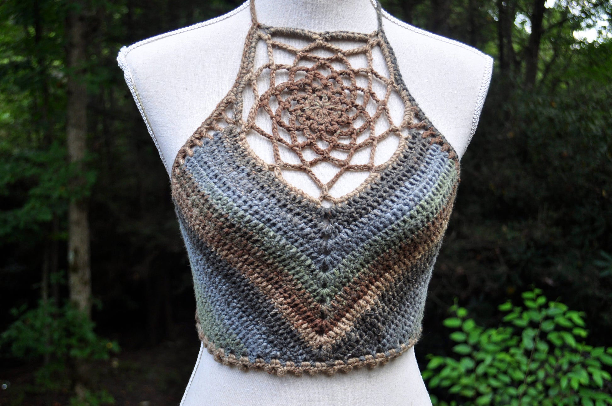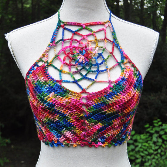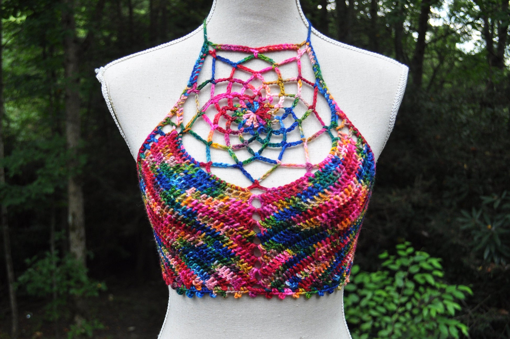 The Dreamcatcher Crop Top is perfect for hot summer days and layering through the colder months It features a large, lacy dreamcatcher design at the neckline, cropped fit, and a picot edging. the top ties at the neck using halter ties and at the back using a separate crocheted cord