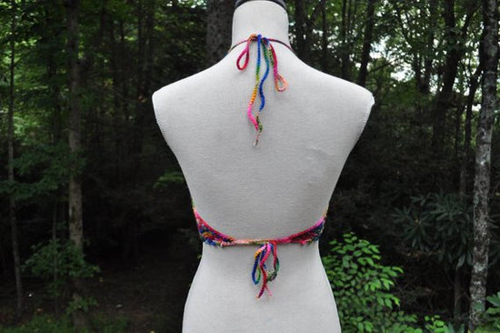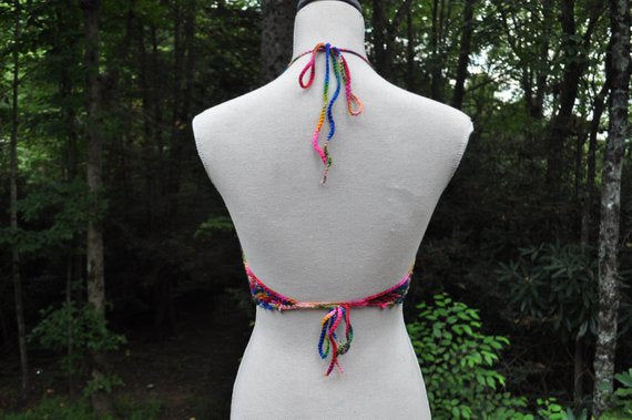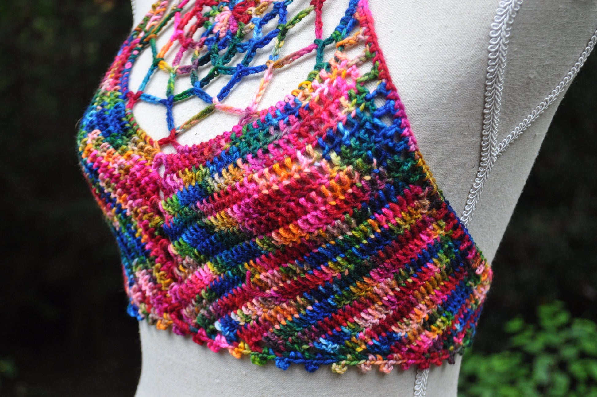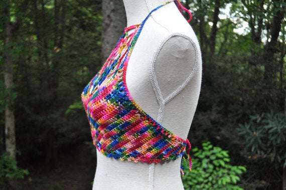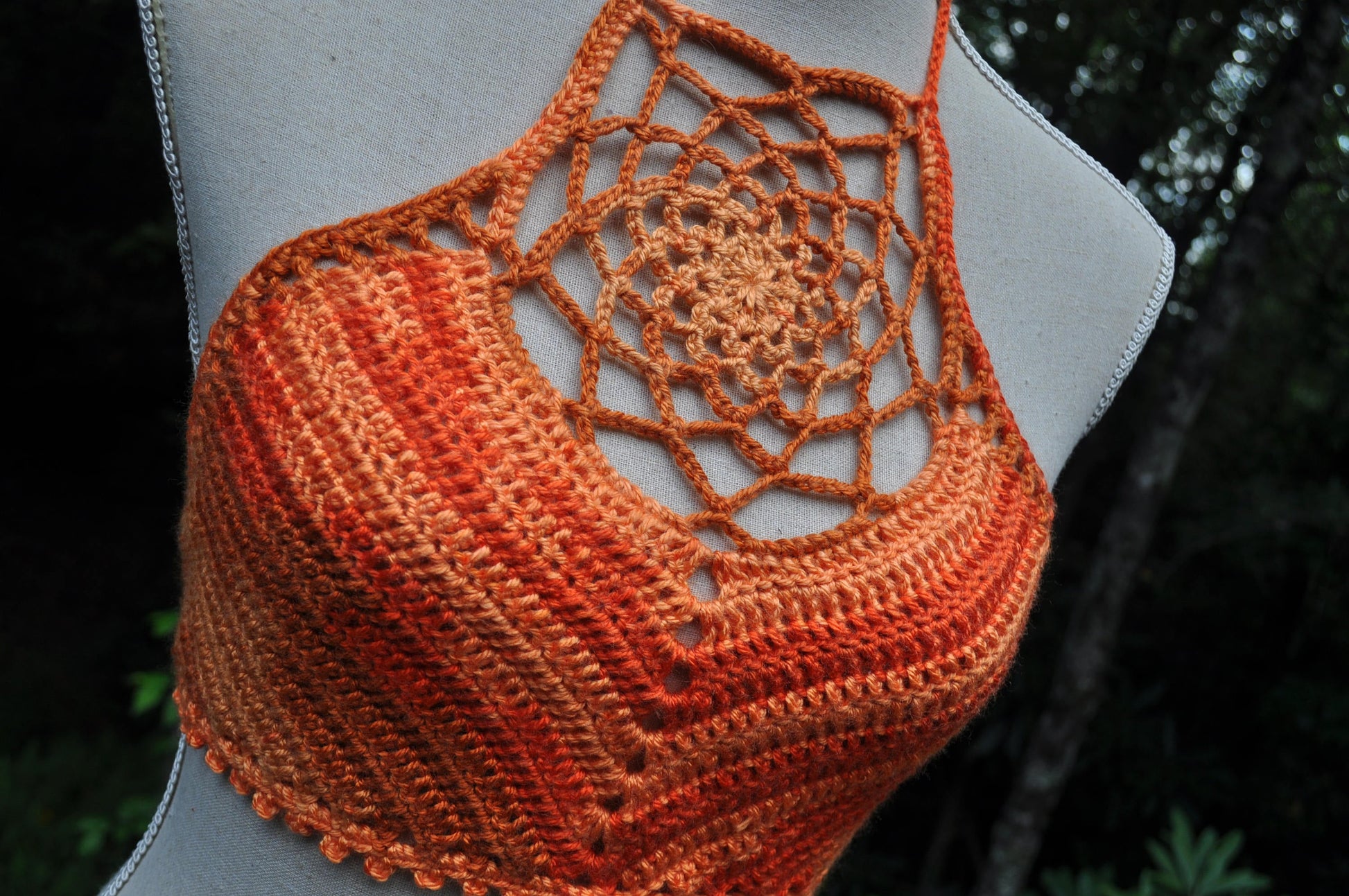 The Dreamcatcher Crop Top is perfect for hot summer days and layering through the colder months It features a large, lacy dreamcatcher design at the neckline, cropped fit, and a picot edging. the top ties at the neck using halter ties and at the back using a separate crocheted cord