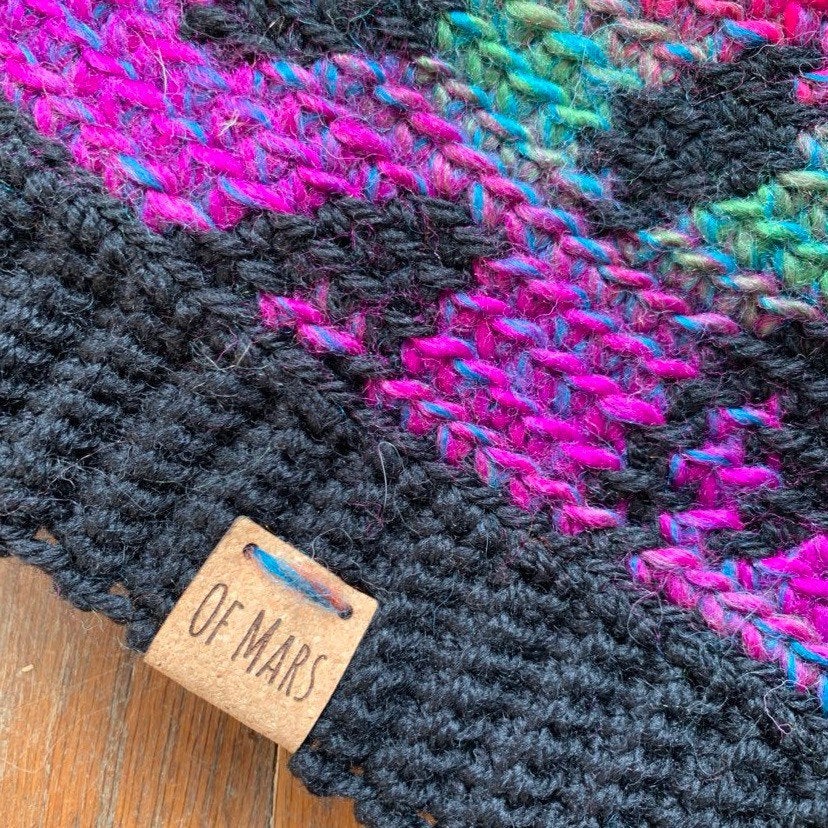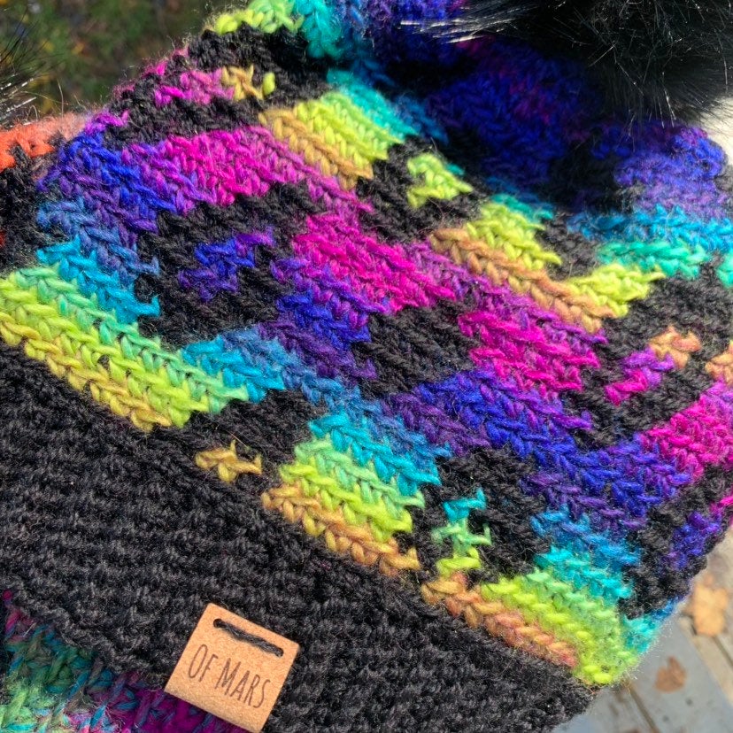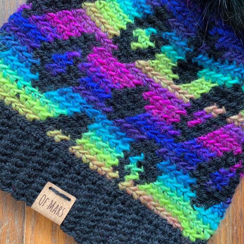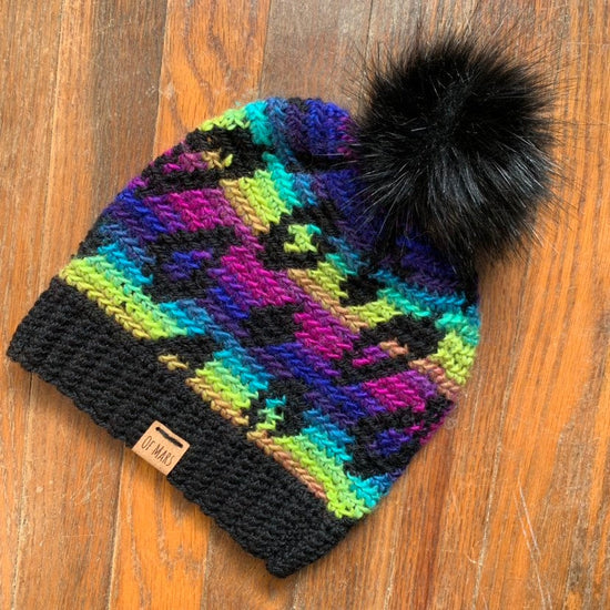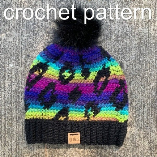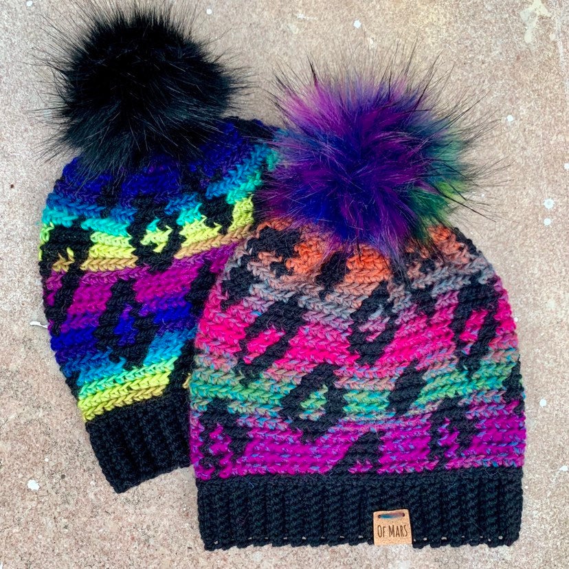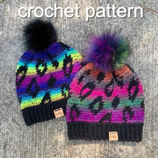 The Wild Thing Leopard Print hat is a fun, easy tapestry crochet project that is a great project for anyone looking to learn tapestry crochet. This hat was inspired by the iconic Lisa Frank rainbow leopards. It features funky leopard print, a ribbed band, and looks great with a big fluffy pompom! The pattern includes a chart of the leopard print.