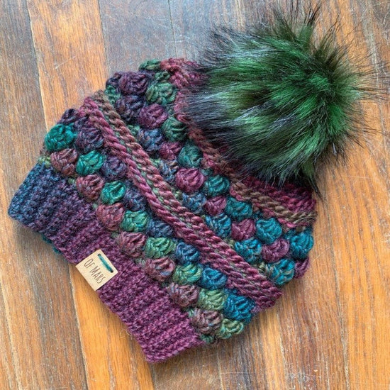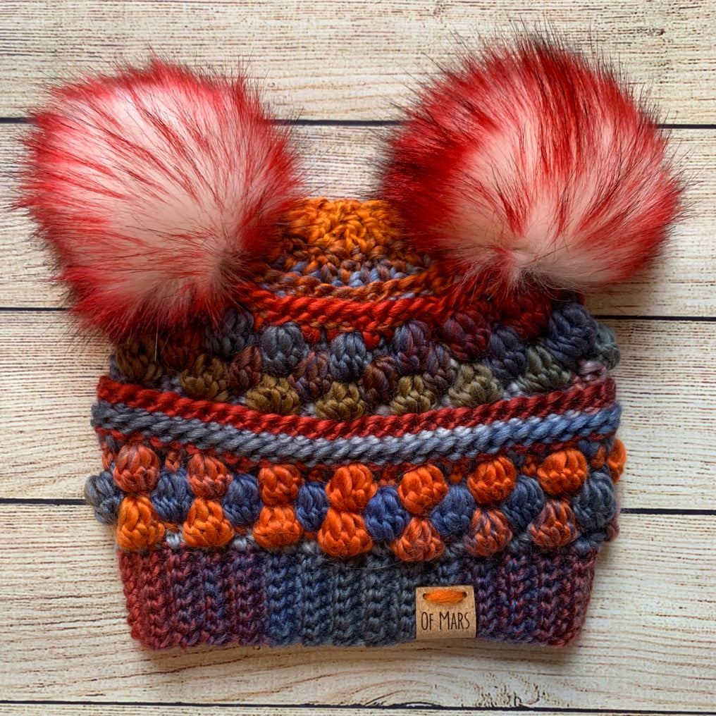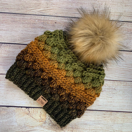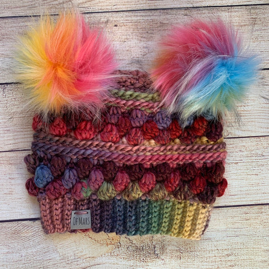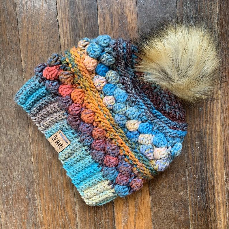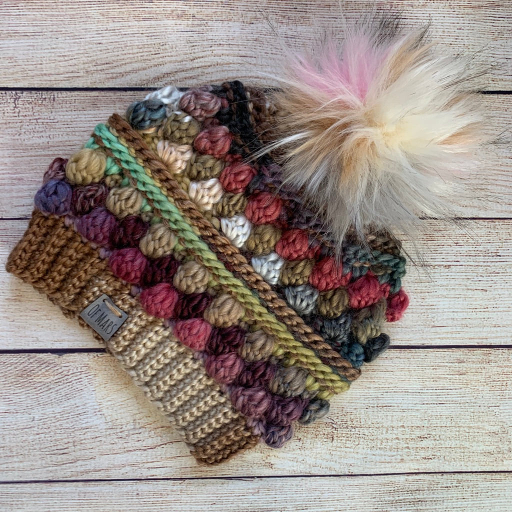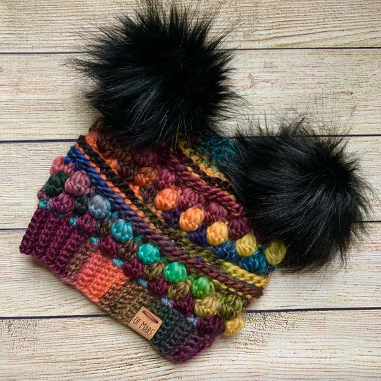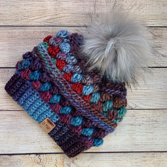 The Wobble Bobble Beanie is a fun pattern with tons of texture to really make your yarn pop! It features several rounds of bobbles sandwiched between textured post stitches. It has a ribbed band and looks great with a big fluffy pompom! It only has 16 rounds + the band, so it is a fairly quick project
