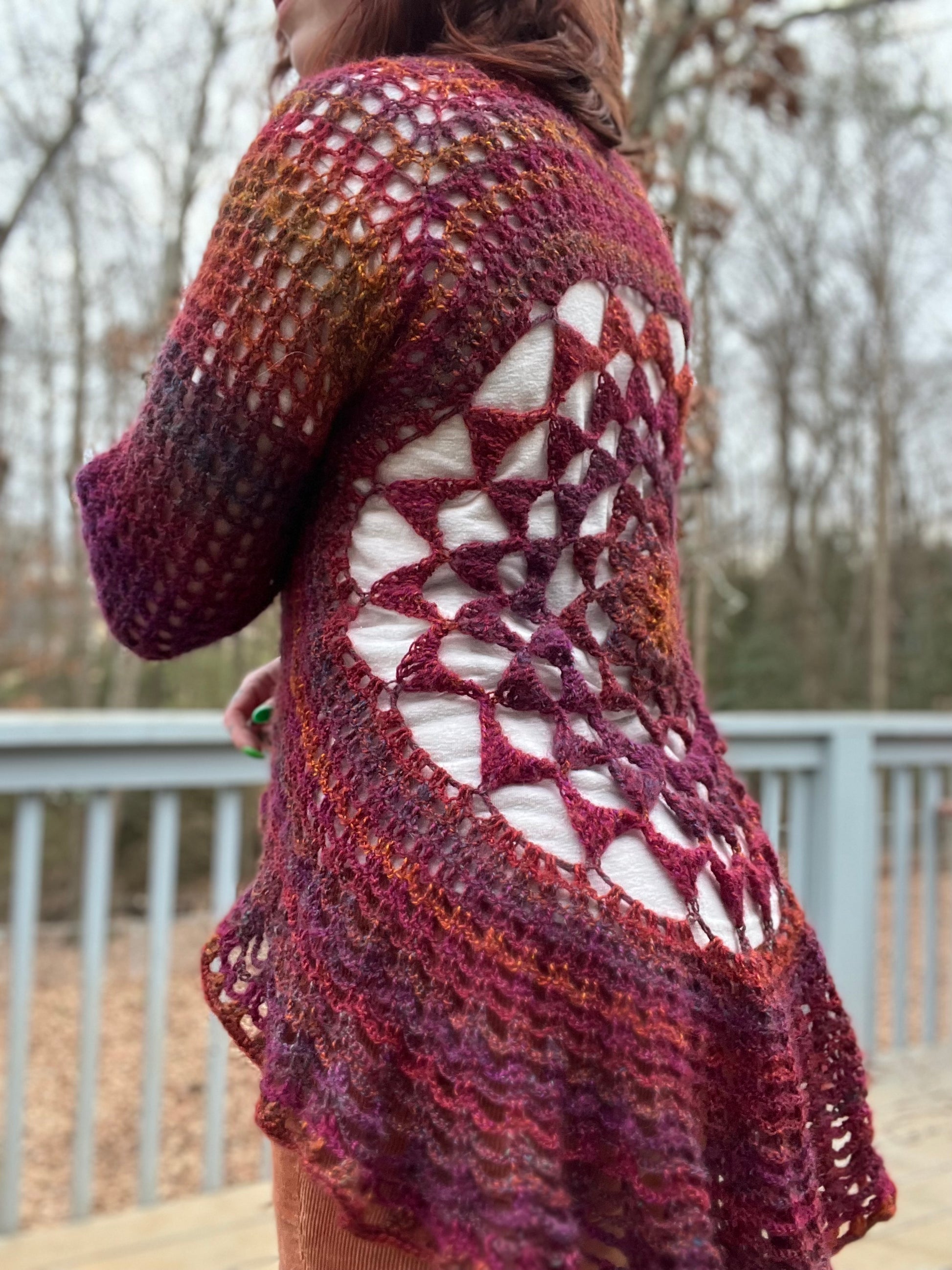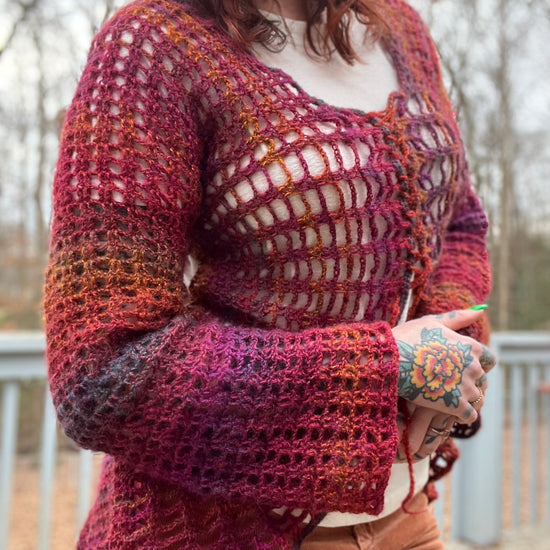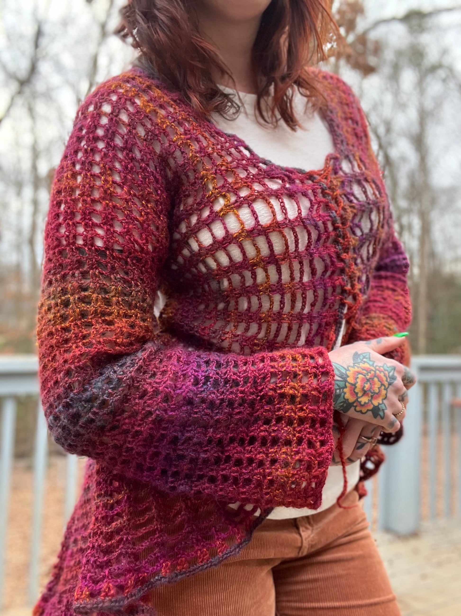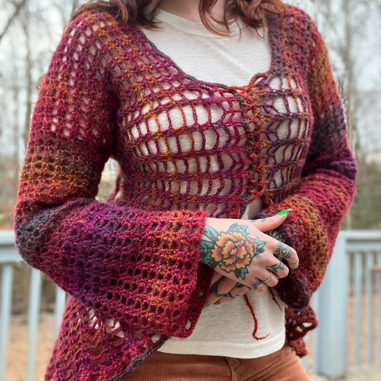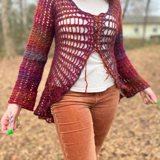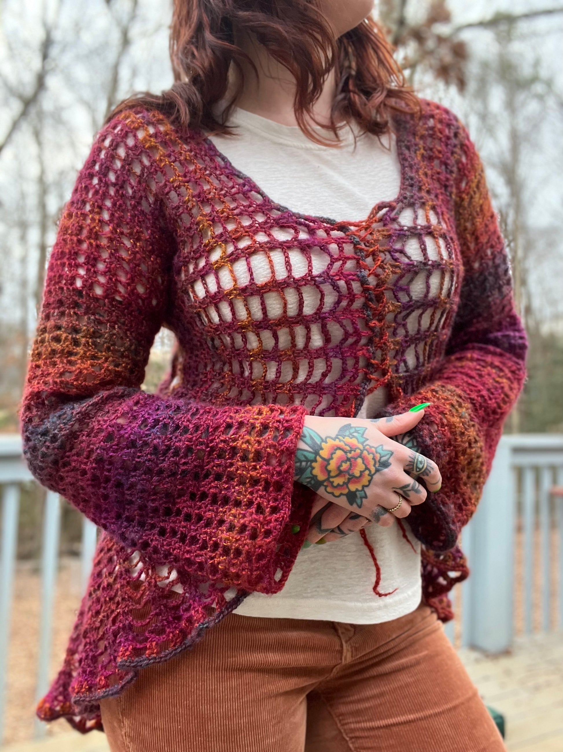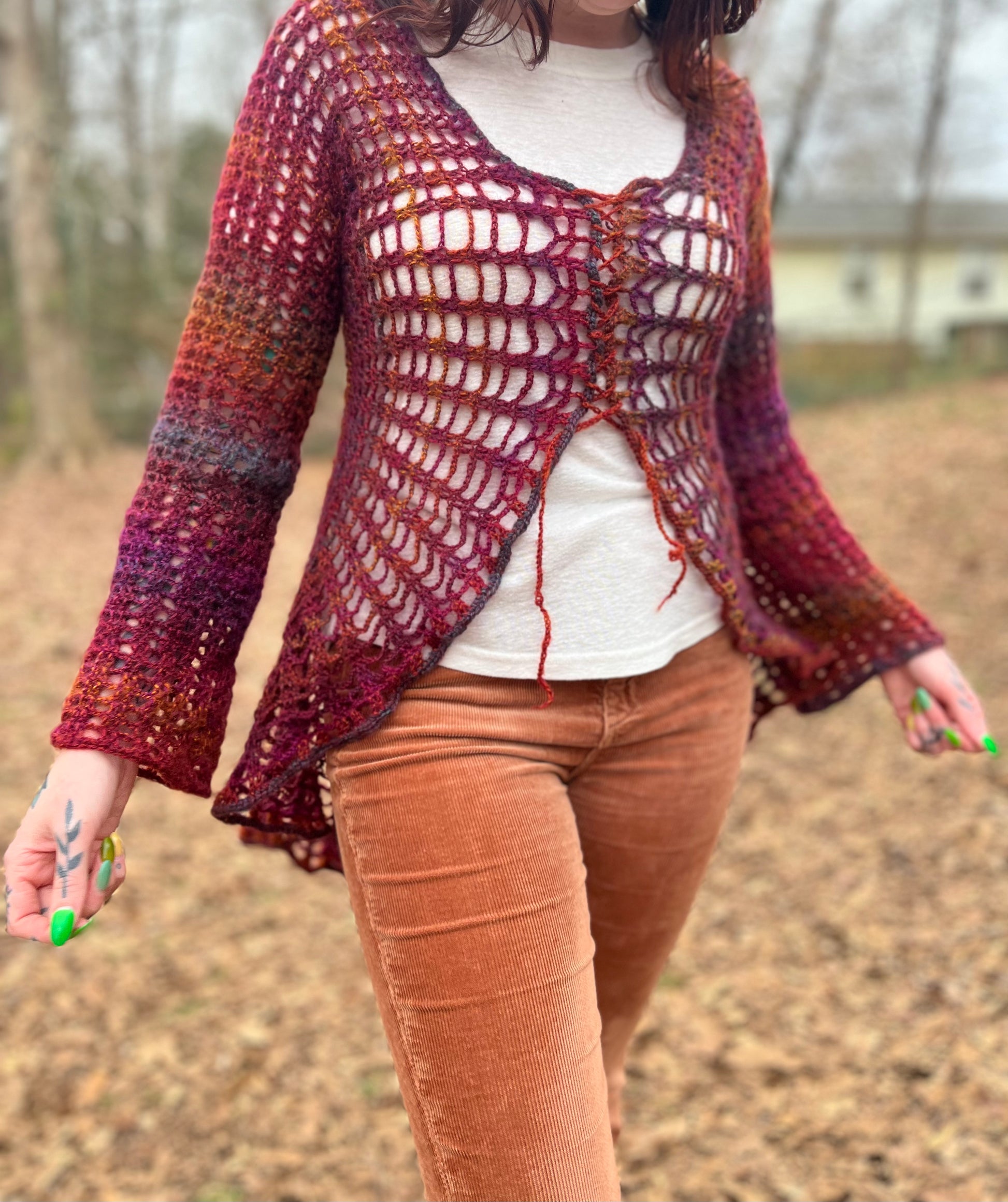It features an openwork petal back, a slight flutter hem, and a lace up front. It is made in all one piece, so there is NO seaming (yay!) It is made with a lightweight yarn, so it's a perfect spring or early fall layer.