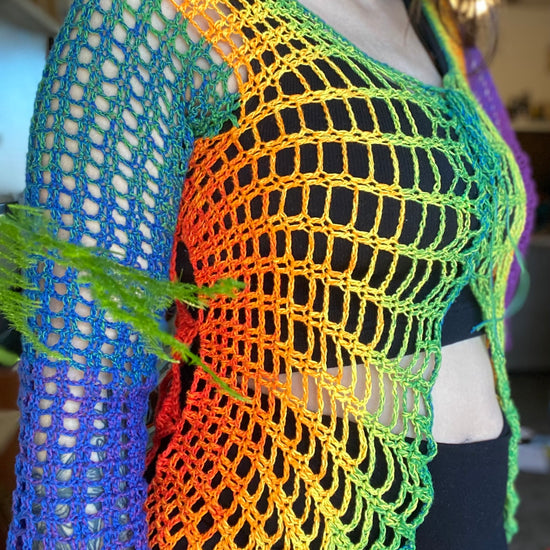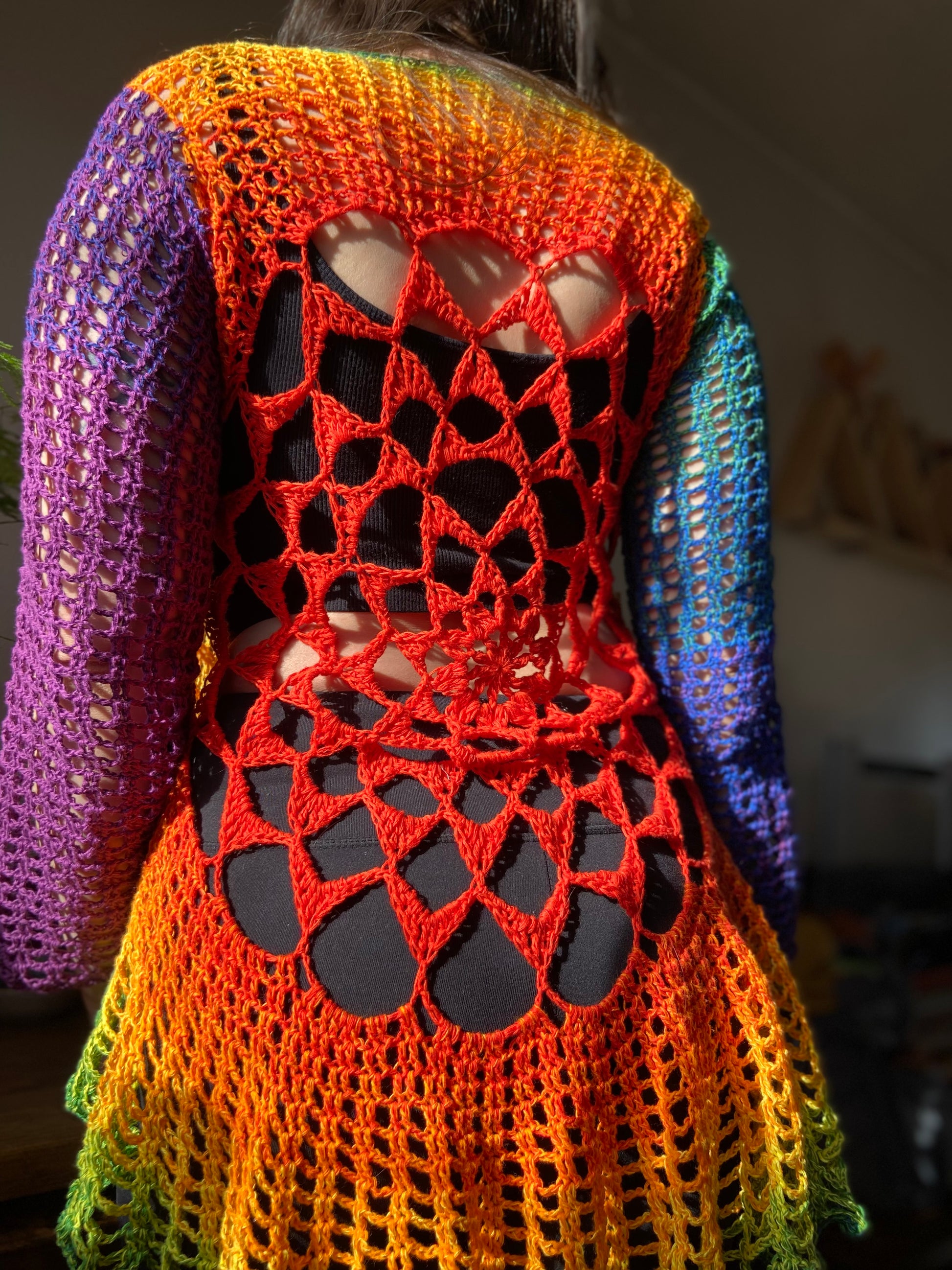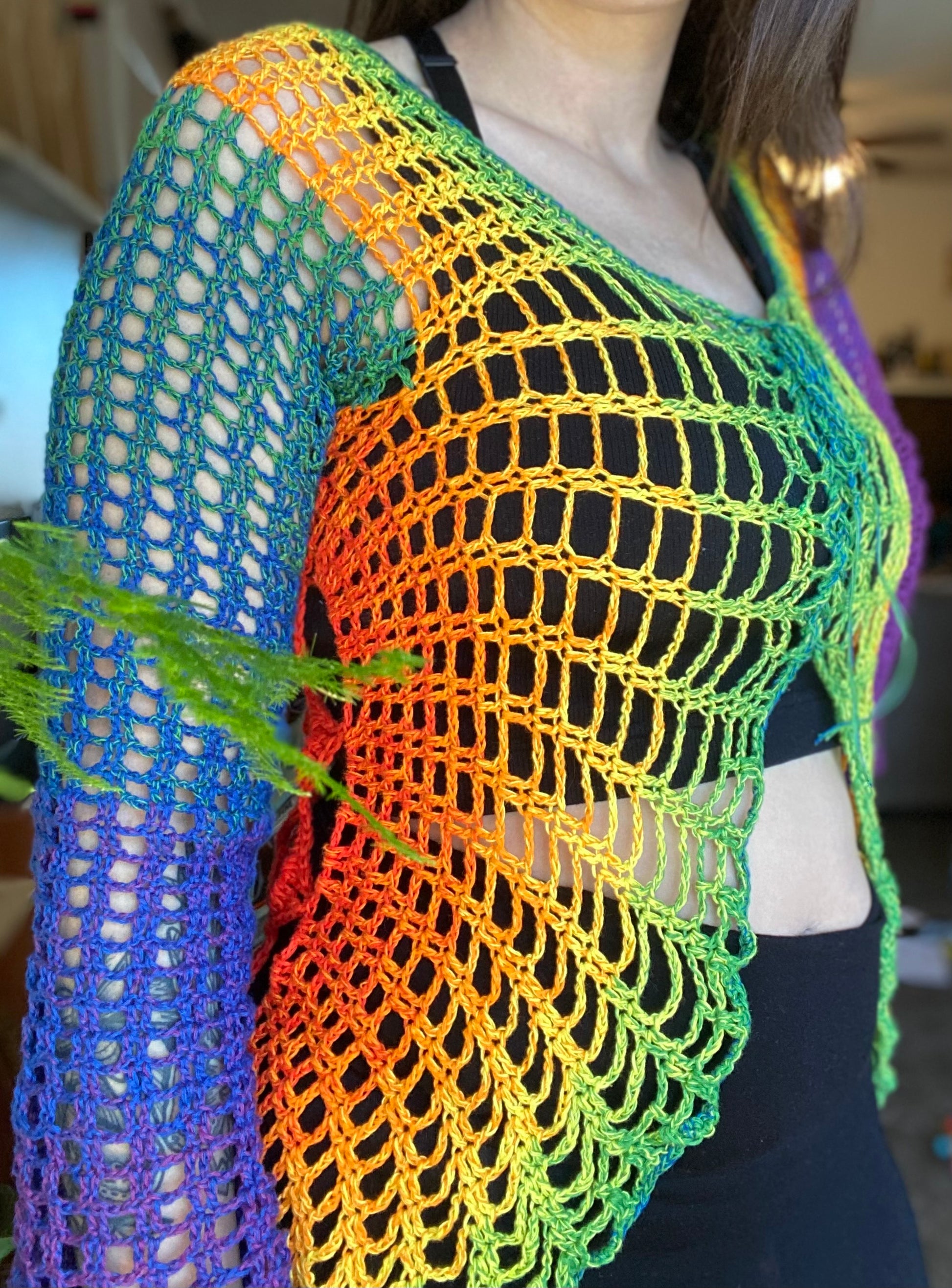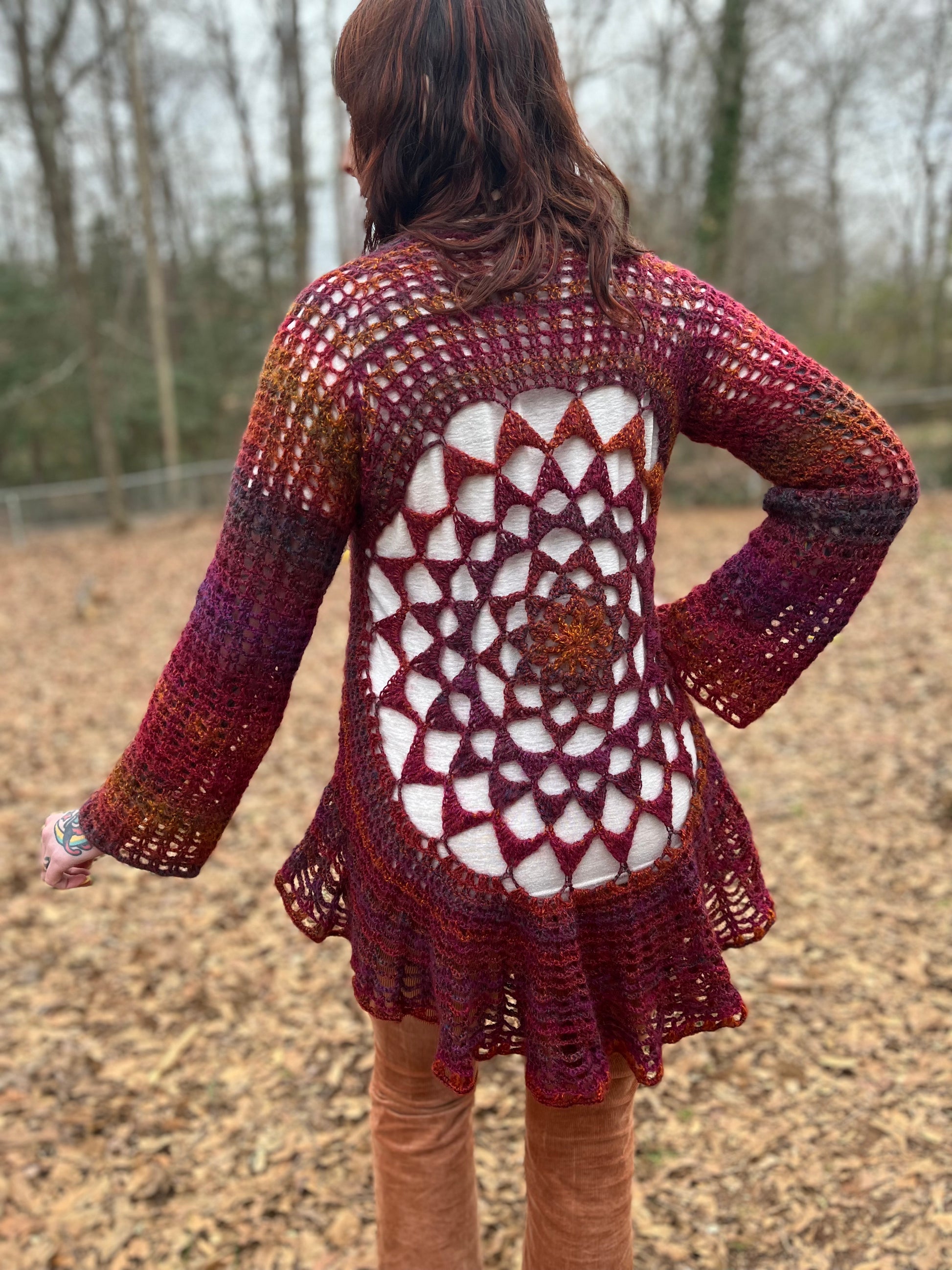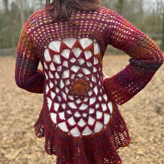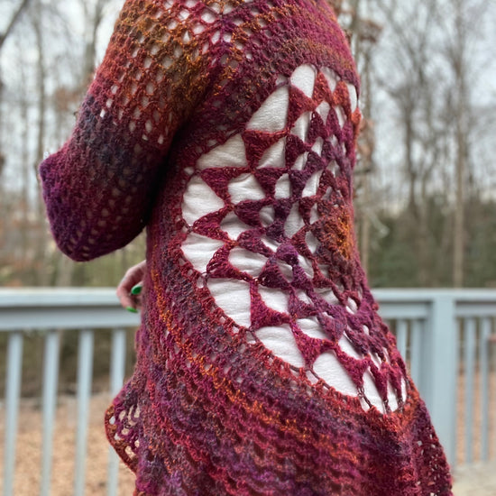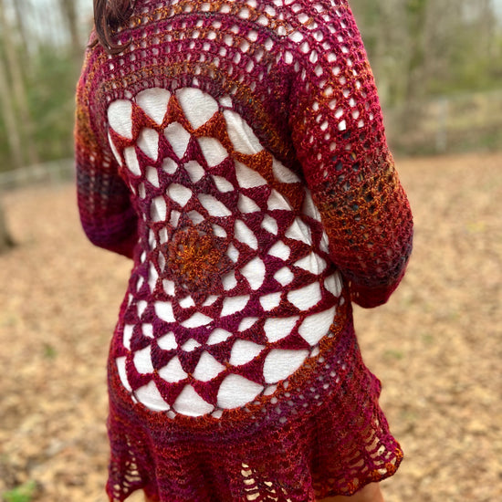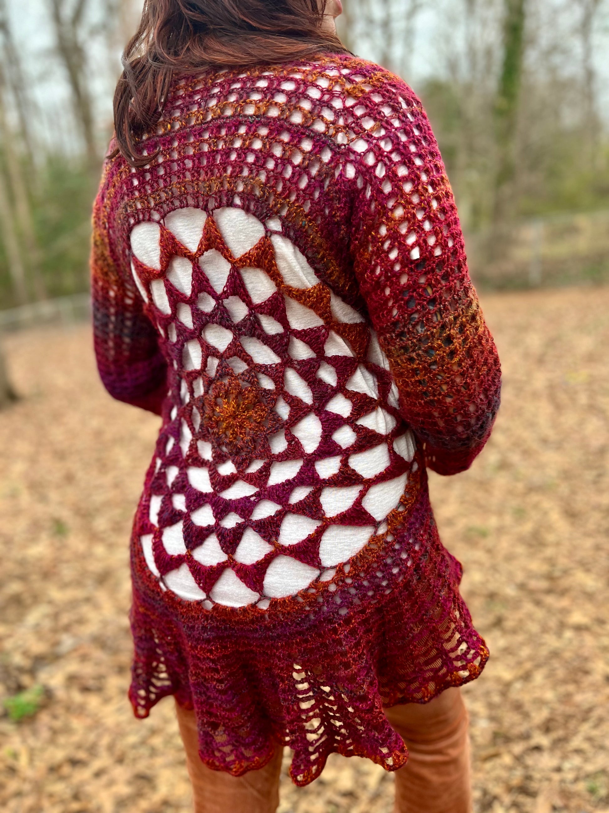 It features an openwork petal back, a slight flutter hem, and a lace up front. It is made in all one piece, so there is NO seaming (yay!) It is made with a lightweight yarn, so it's a perfect spring or early fall layer.
