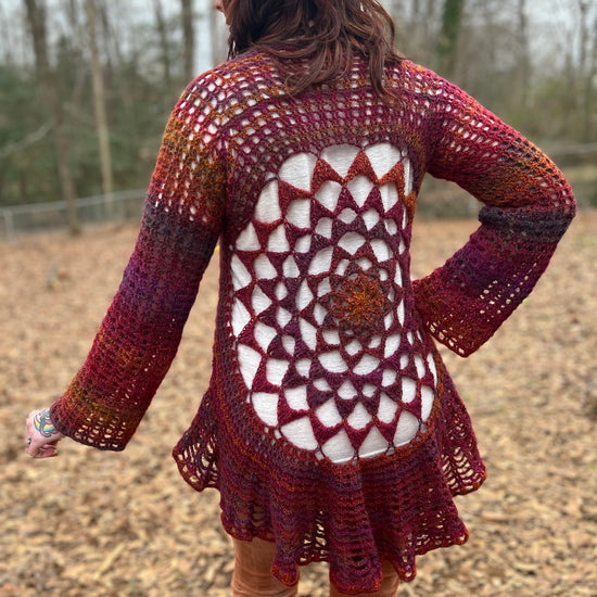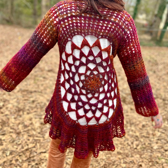 The Dahlia Sweater comes in 2 sizes: S/M and L/XL. The size is determined by the gauge of the project and the size hook that is used. The S/M can fit up to a 36'' bust and the L/XL can fit up to a 41'' bust. The sweater could easily be made larger by using a weight 3 yarn and increasing your hook size.