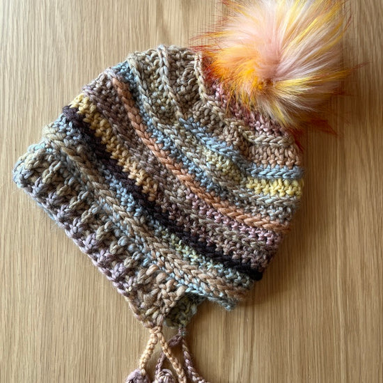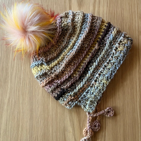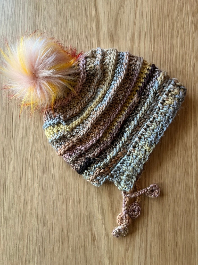 The Slouchy Bonnet features simple, subtle texture and fun little tassels. It is topped with a fluffy faux fur pompom that attaches with a snap for easy removal
