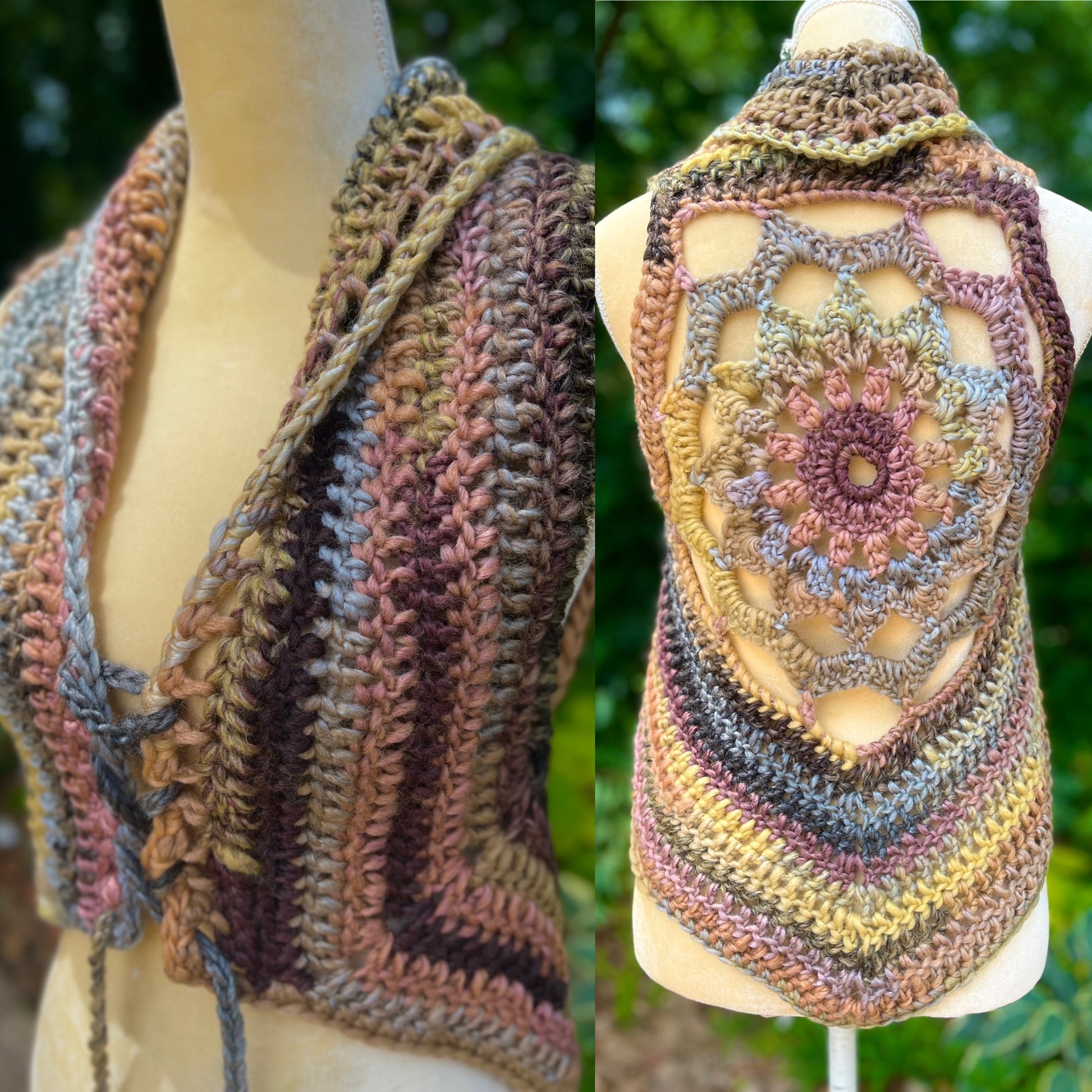 This Free Spirit Vest was stitched up in my desert rose yarn and features pixie point edging and a lace up front