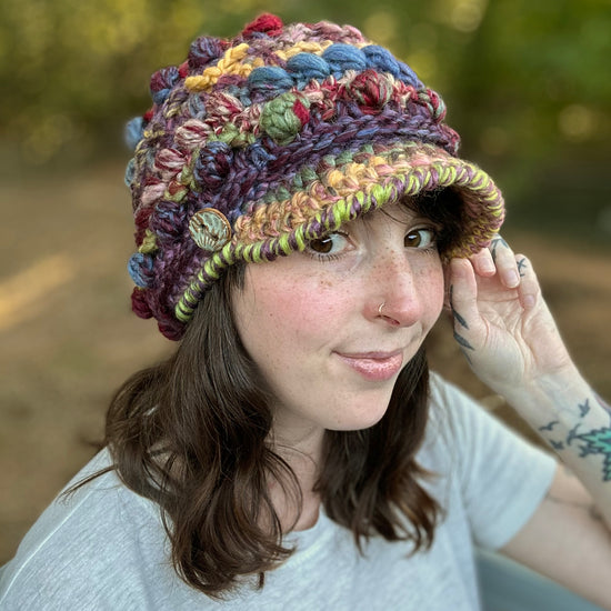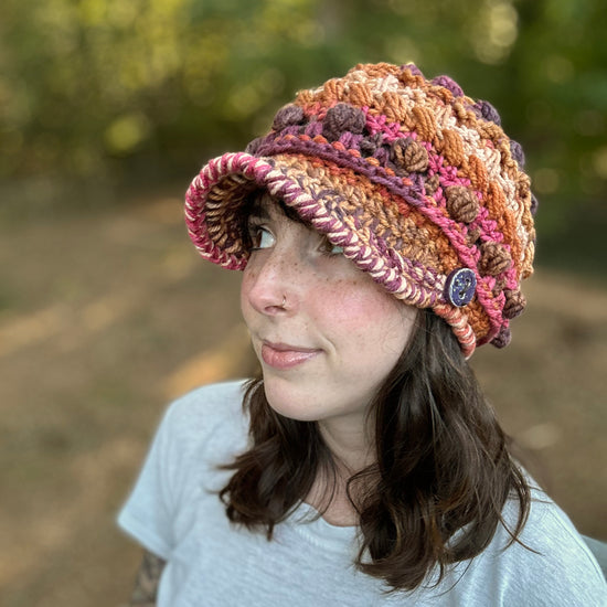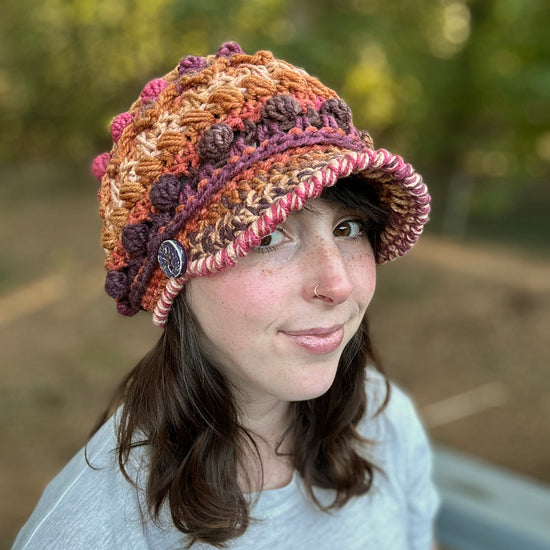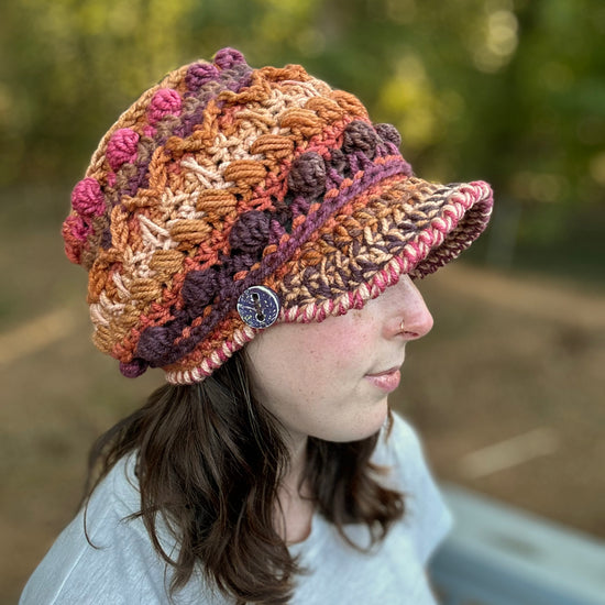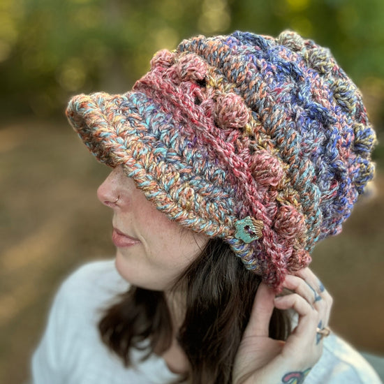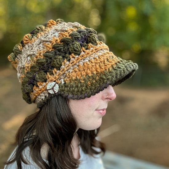 The Fable Cap features loads of texture and a double layered brim! It has a bunch of different stitches, so each row is fun to stitch and creates a new challenge. The brim is stitched in a way where it can stand up on it's own, so you don't need any additional materials other than your yarn and crochet hook. The brim comes in 2 lengths - a 2'' brim and a 2.75'' brim. Both lengths are featured in the photos.