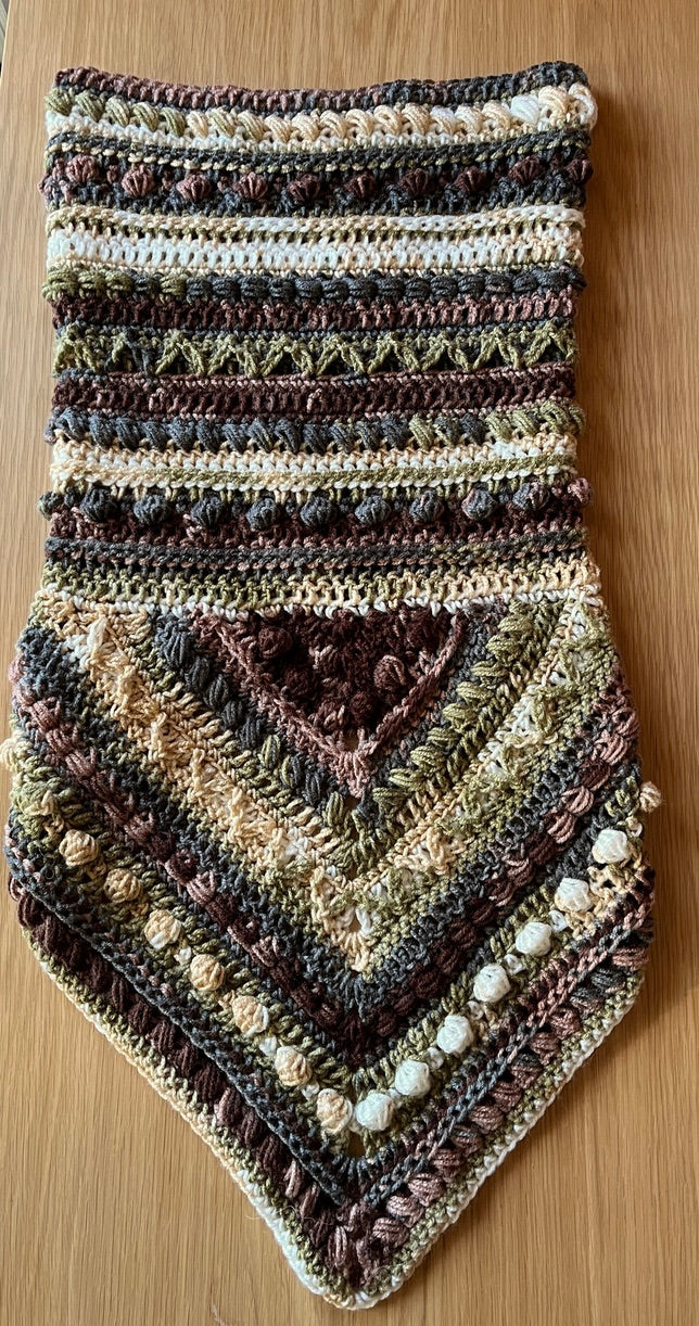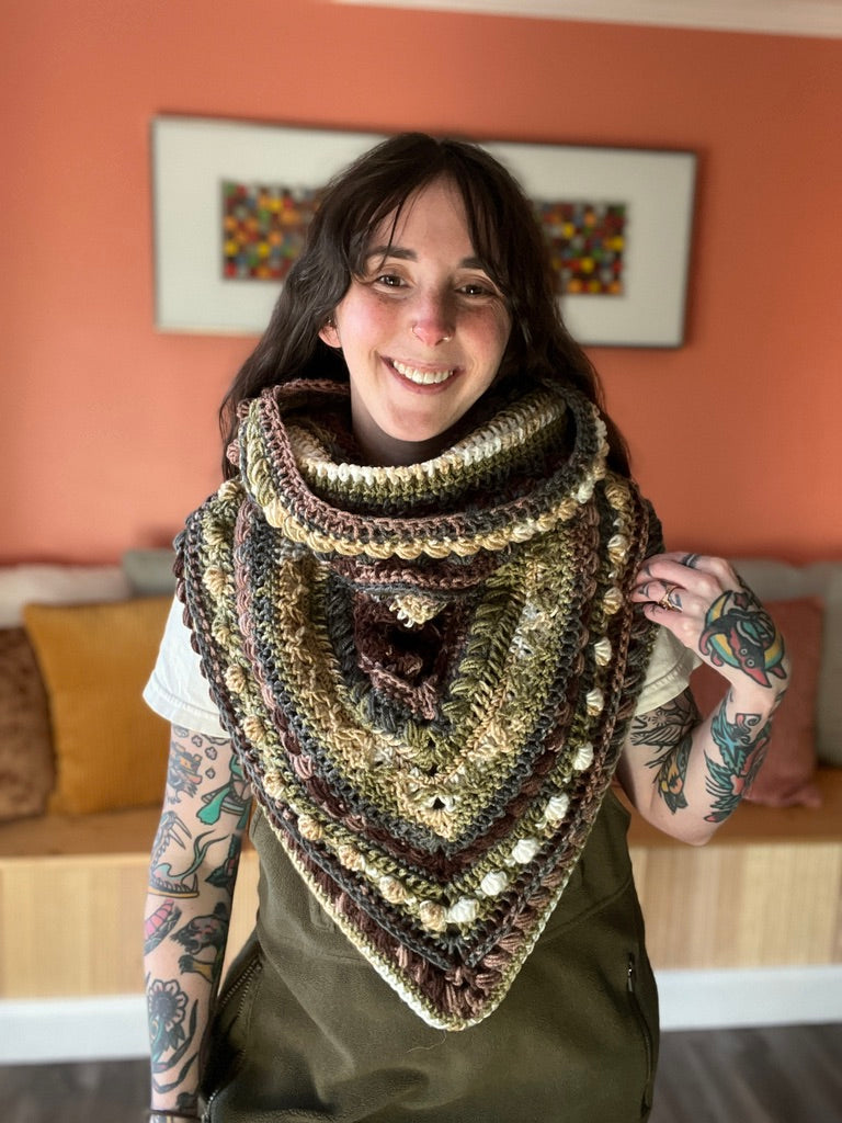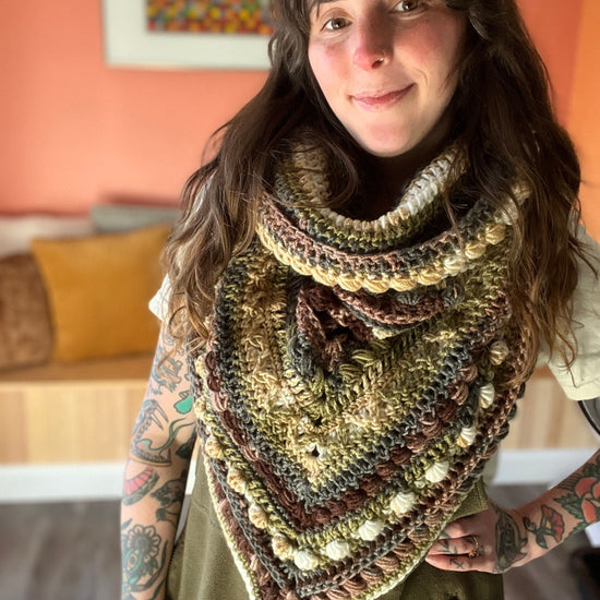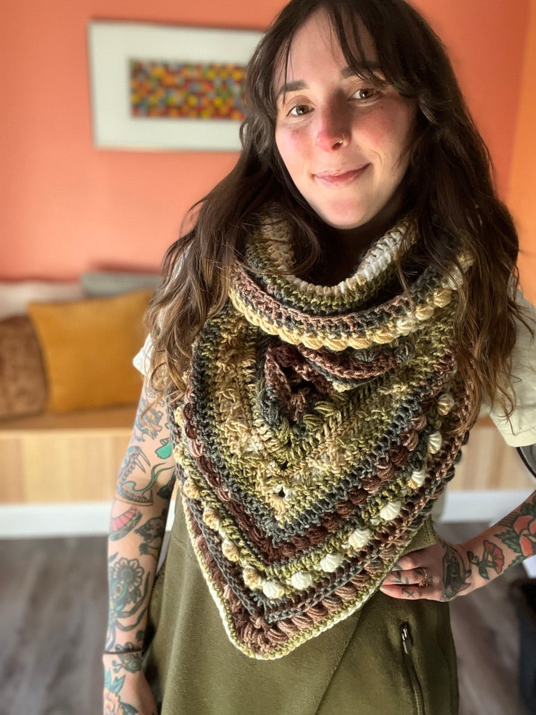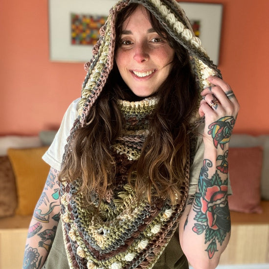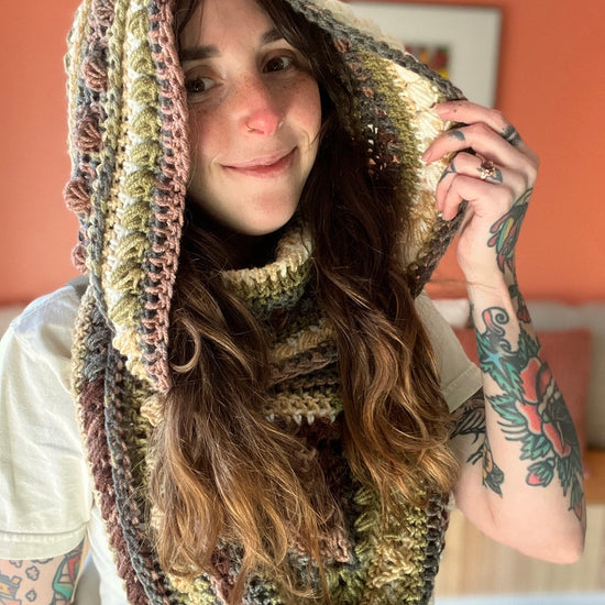 The Fable Cowl features a bandana style front and large cowl neck that can be worn as a hood. It has tons of texture and is a really fun piece to wear