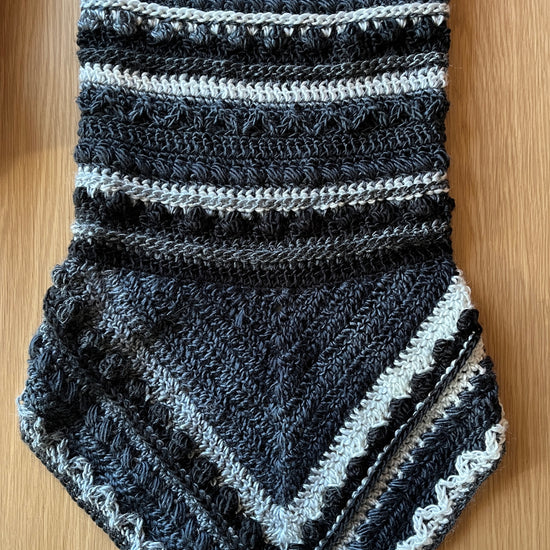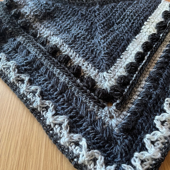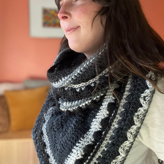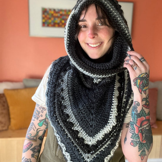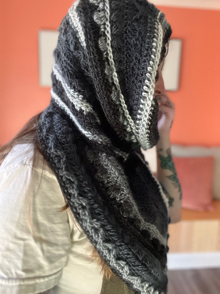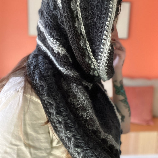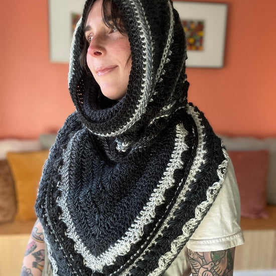 The Fable Cowl features a bandana style front and large cowl neck that can be worn as a hood. It has tons of texture and is a really fun piece to wear
