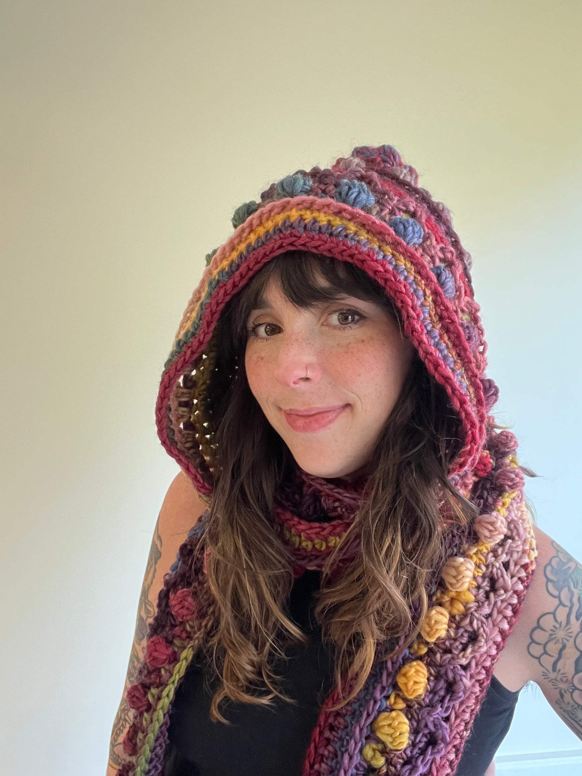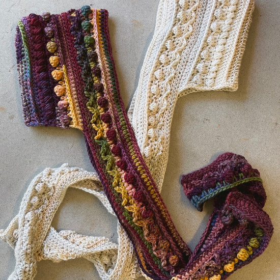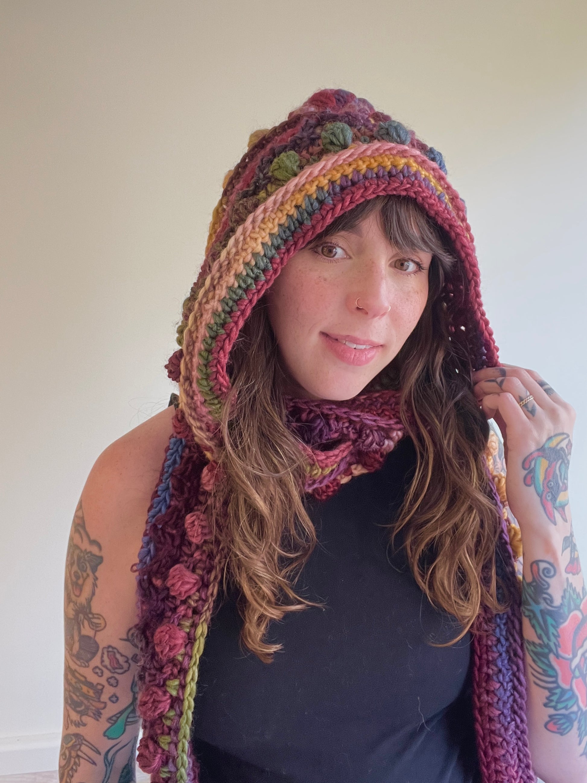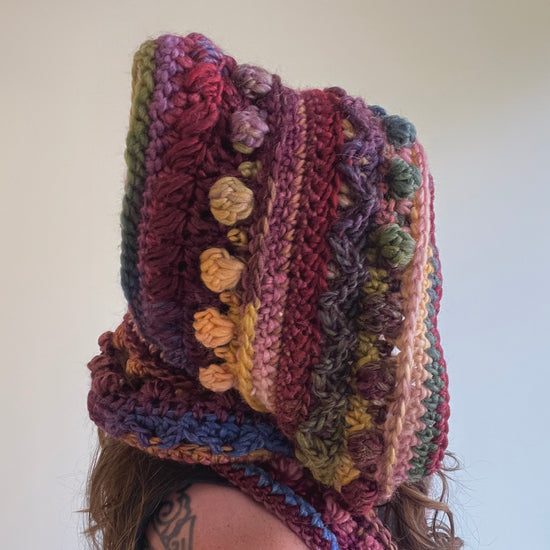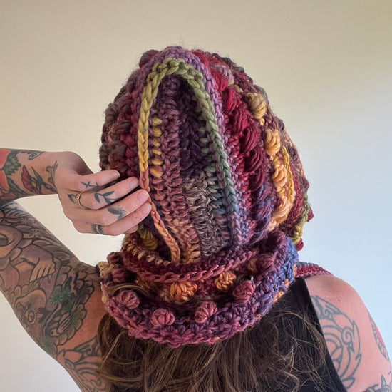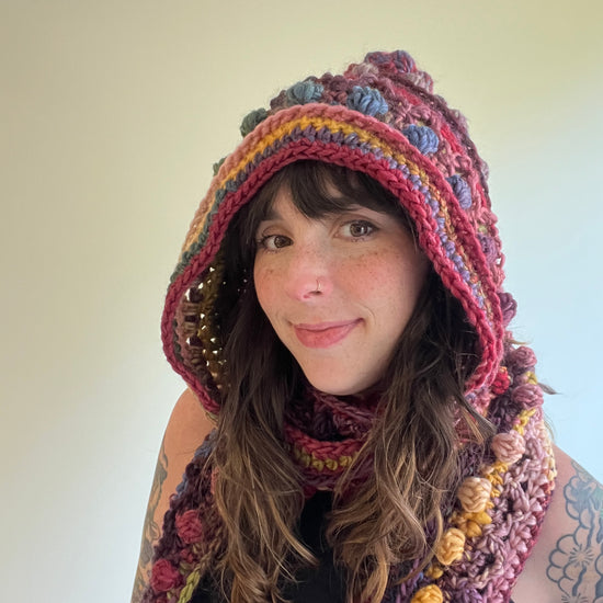 Add a bit of warmth and style to your life with the Fable Hooded Scarf! Each row is different, so it's fun to stitch up and really holds your attention. It is heavily textured and has long scarf-y bits to wrap yourself up in. It's something that can easily be completed while watching a few nights of your favorite show on the couch 🙂