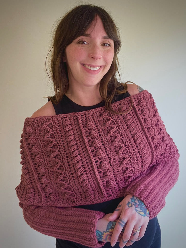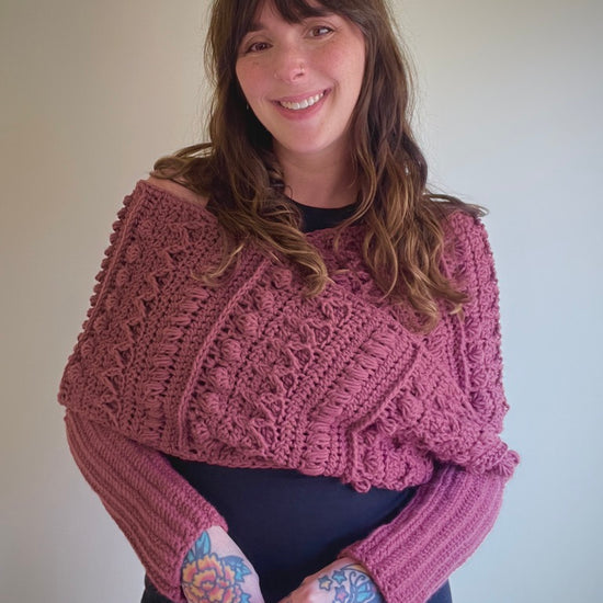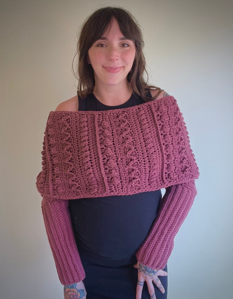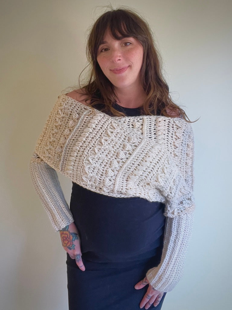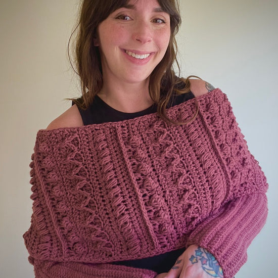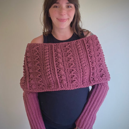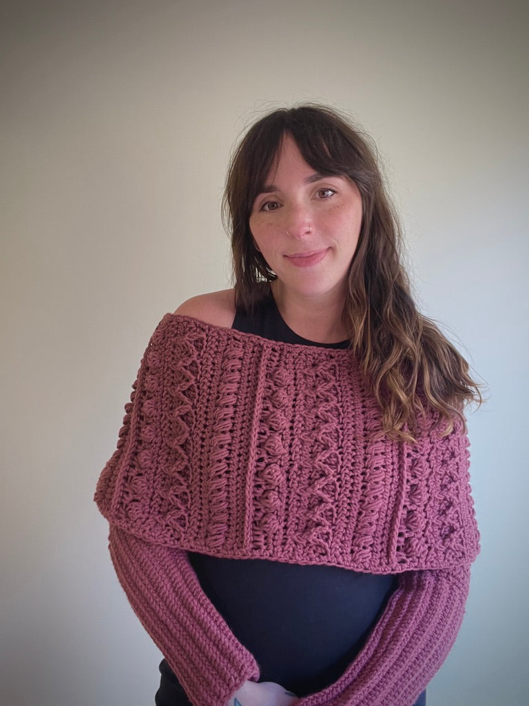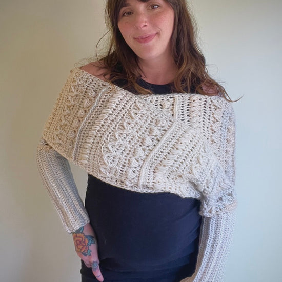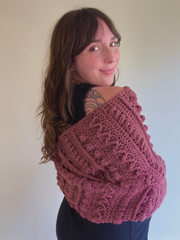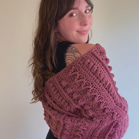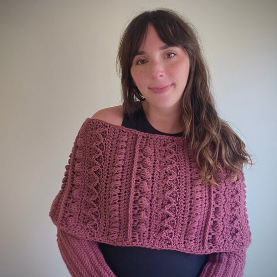 The Fable Wrap has all the fun texture of my other Fable patterns but in a stylish wrap! It can dress up any outfit and would look stunning on a winter bride. The piece can be worn with the twist in the front or in the back and can even be worn as a scarf!