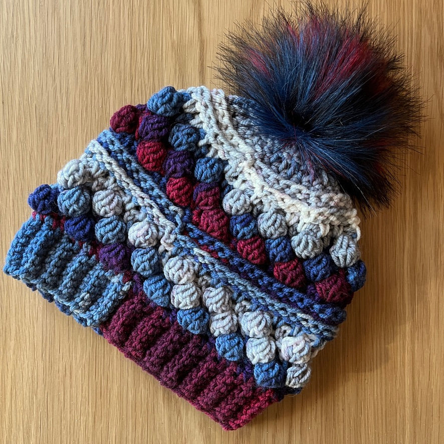 The Wobble Bobble Beanie features funky textured stitching and is topped with fluffy faux fur pompoms. Each of my hats is one of a kind