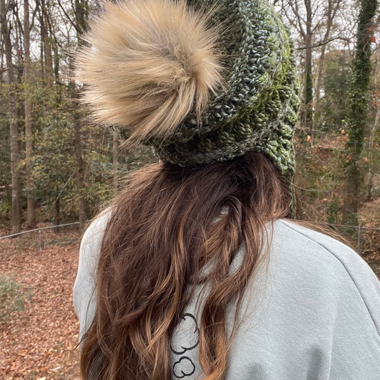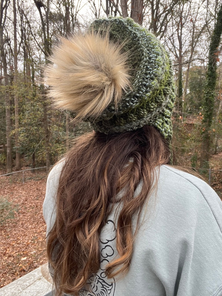 It has a relaxed fit and fun little tassels. It is topped with a fluffy faux fur pompom that attaches with a snap for easy removal
