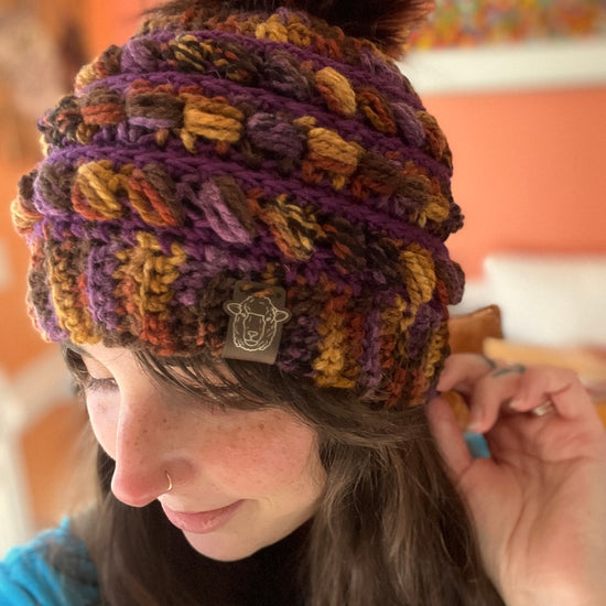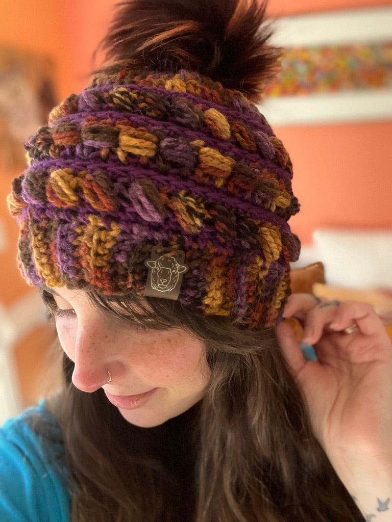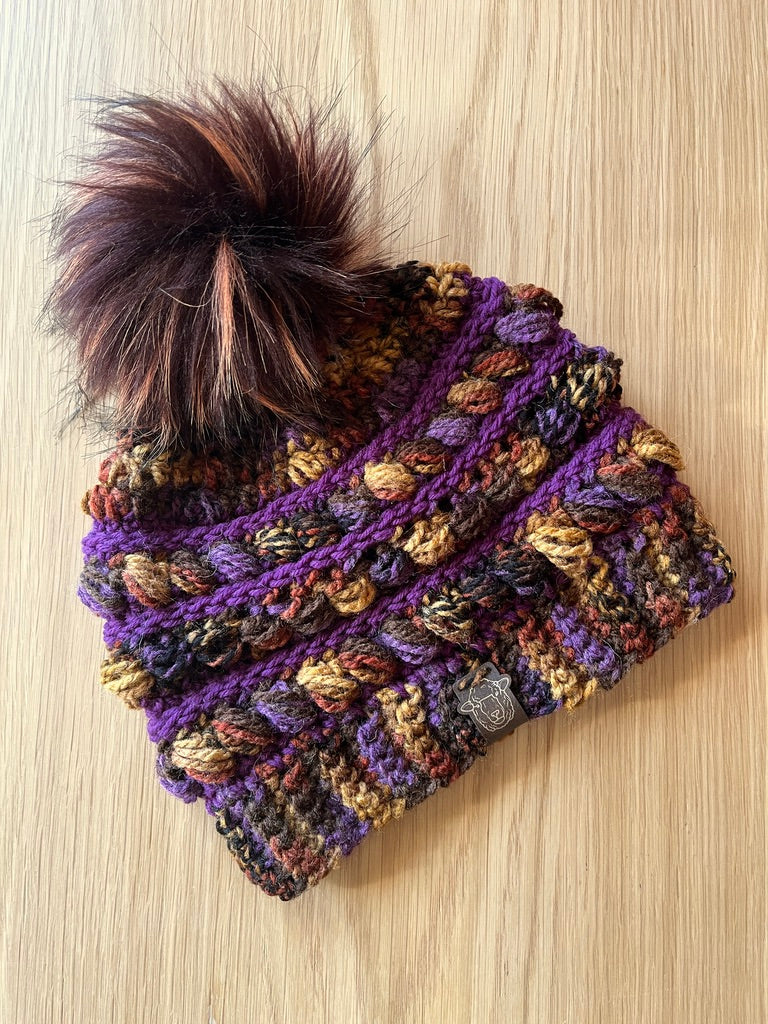 The Mashup Beanie features funky textured stitching and is topped with fluffy faux fur pompoms. Each of my hats is one of a kind