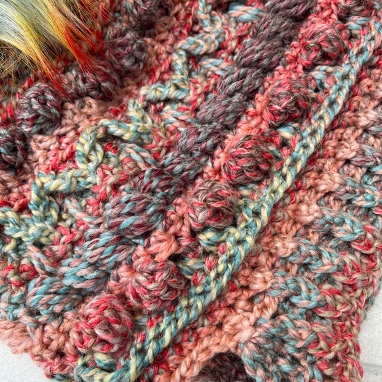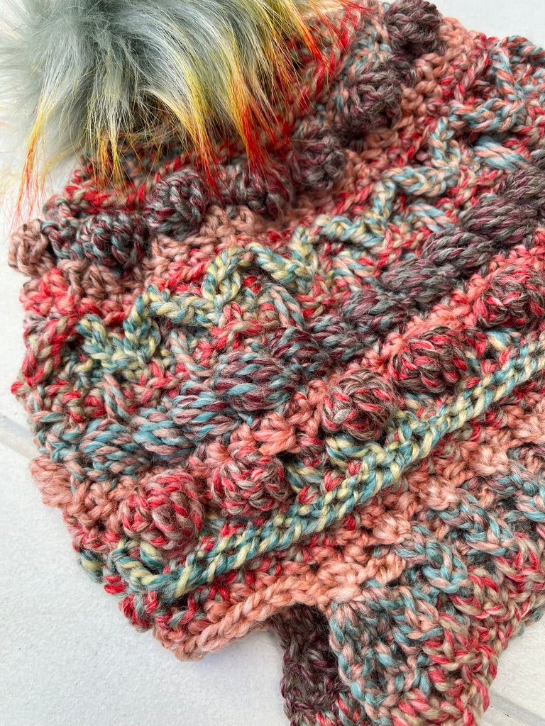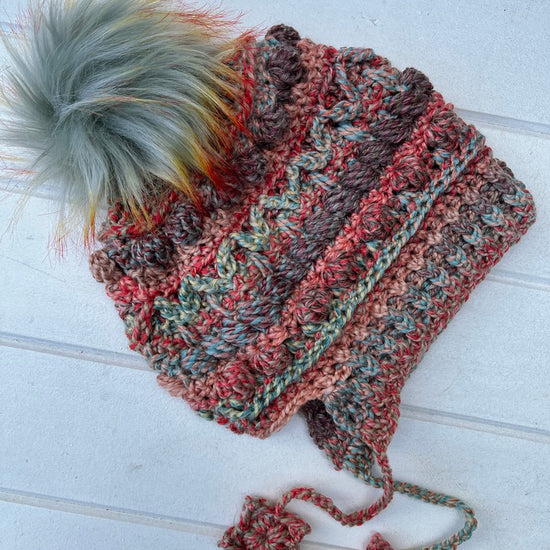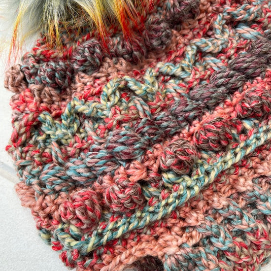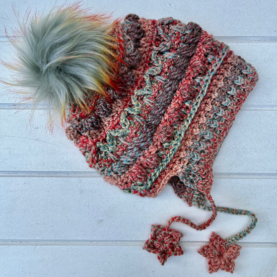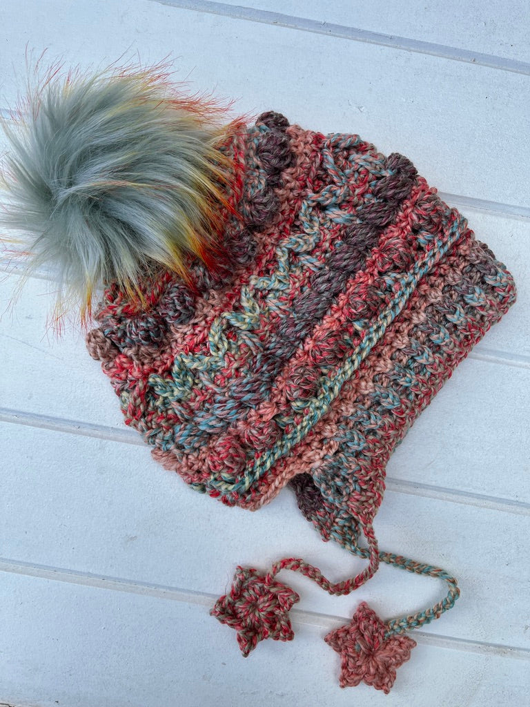 The Fable Bonnet features a slightly slouchy fit with tons of texture, a ribbed band, and cute little star tassels. This yarn and pompom are new ones for me and they turned out to make such a great combo!