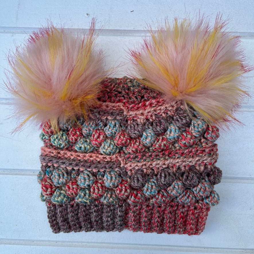 The Wobble Bobble Beanie features funky textured stitching and is topped with fluffy faux fur pompoms. Each of my hats is one of a kind