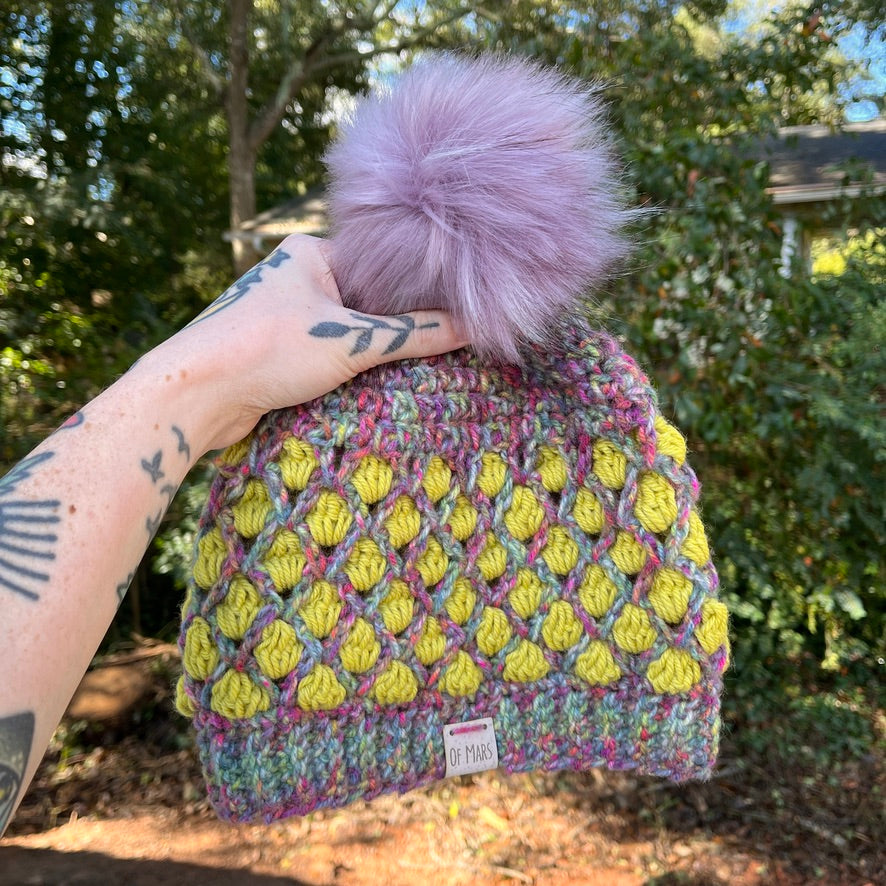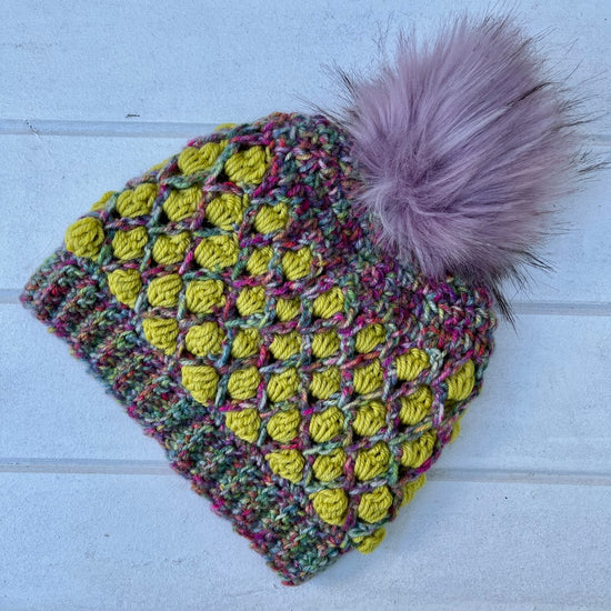 The Lattice Beanie is a new design this year! It uses 2 different yarns to create a fun bobble texture separated by a lattice.