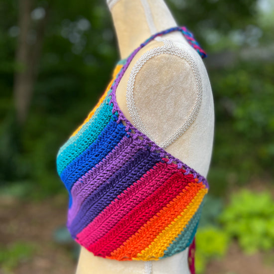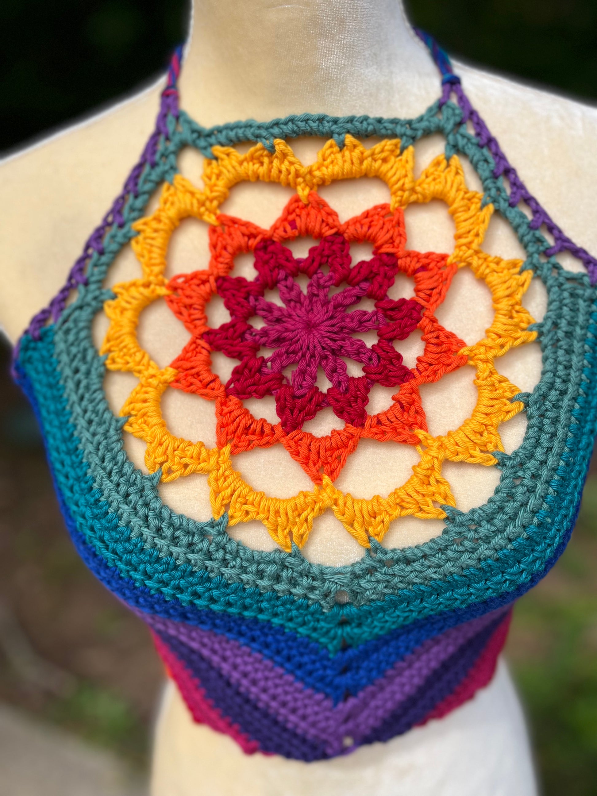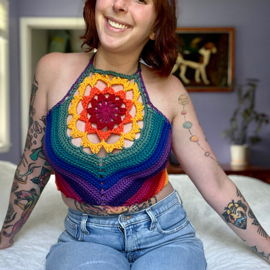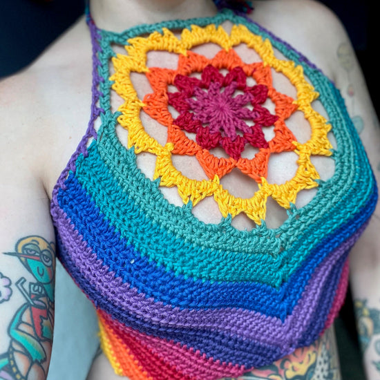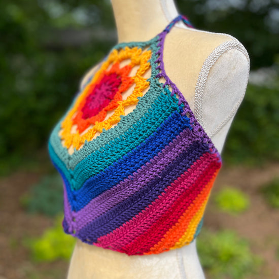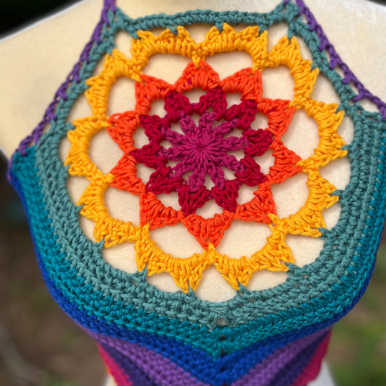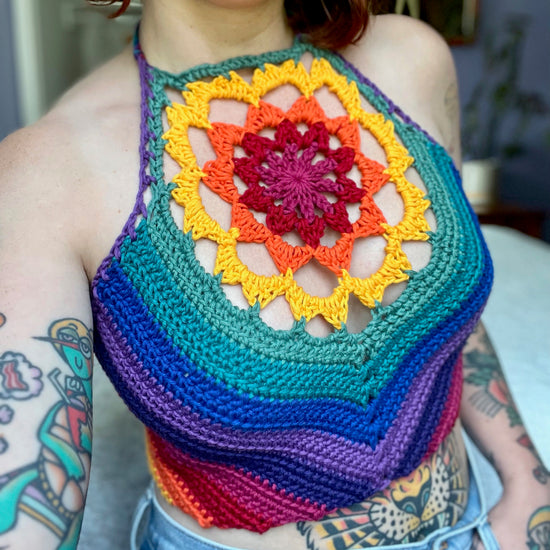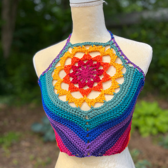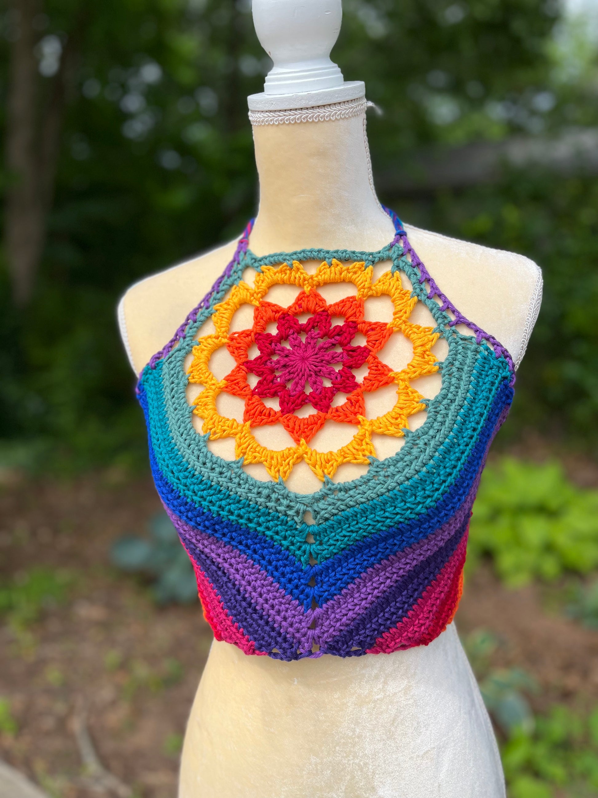 The Mandala Crop Top features a fun mandala at the center, lace up back, and an ombre rainbow pattern. It pairs great with high waisted skirts & shorts or layered under dresses