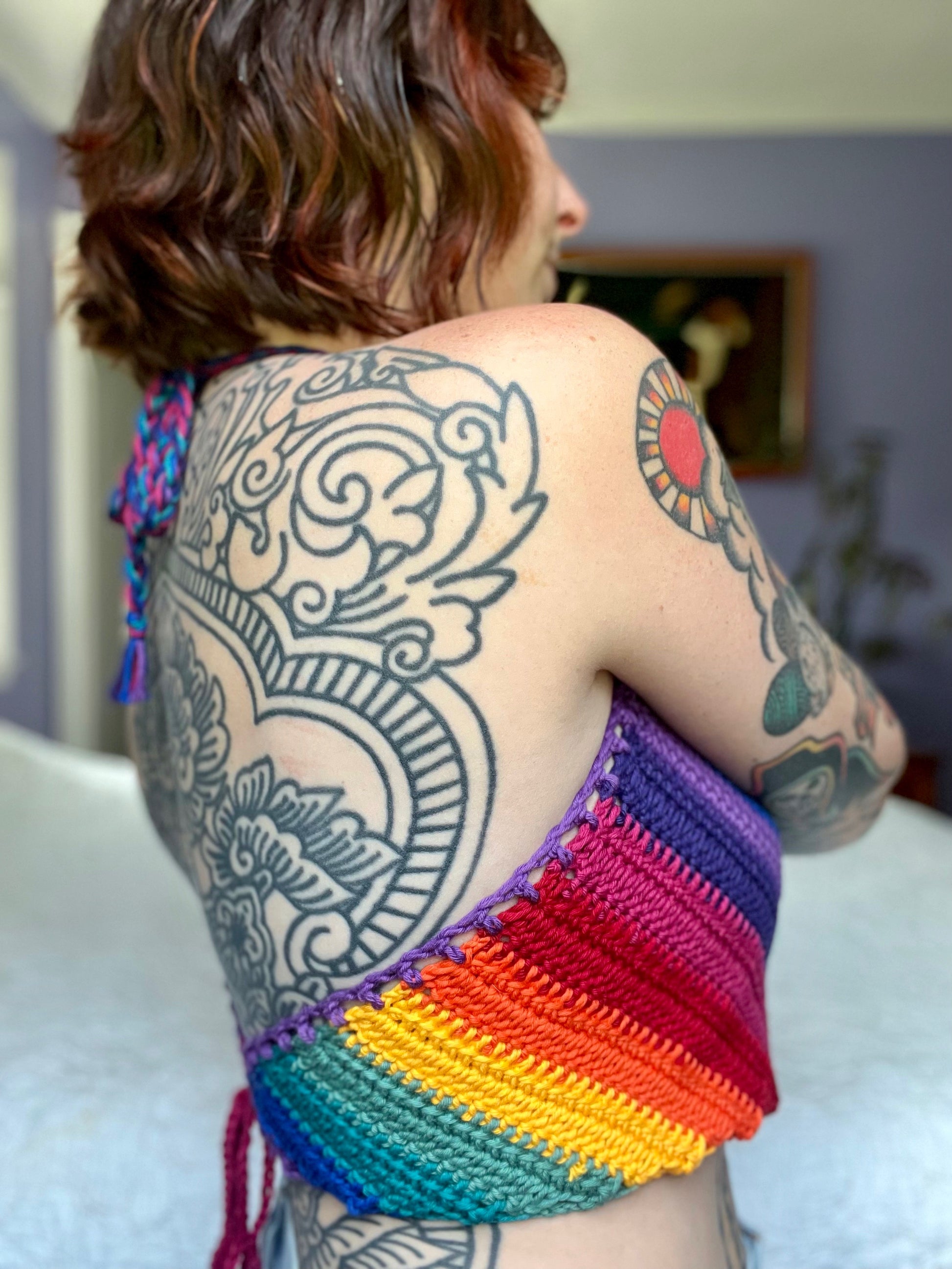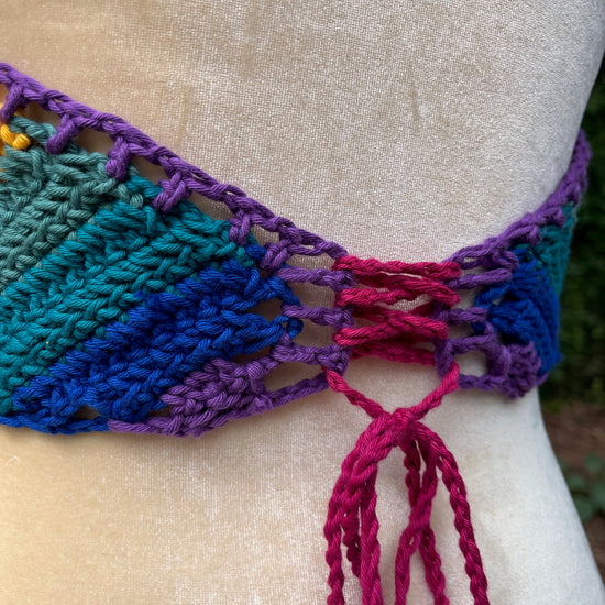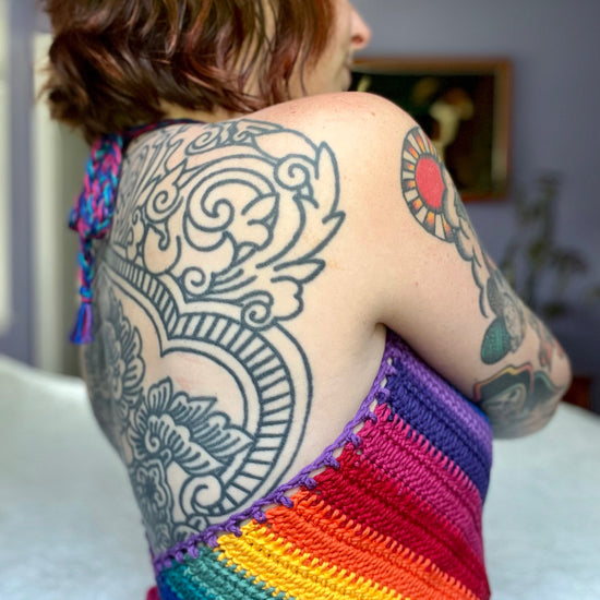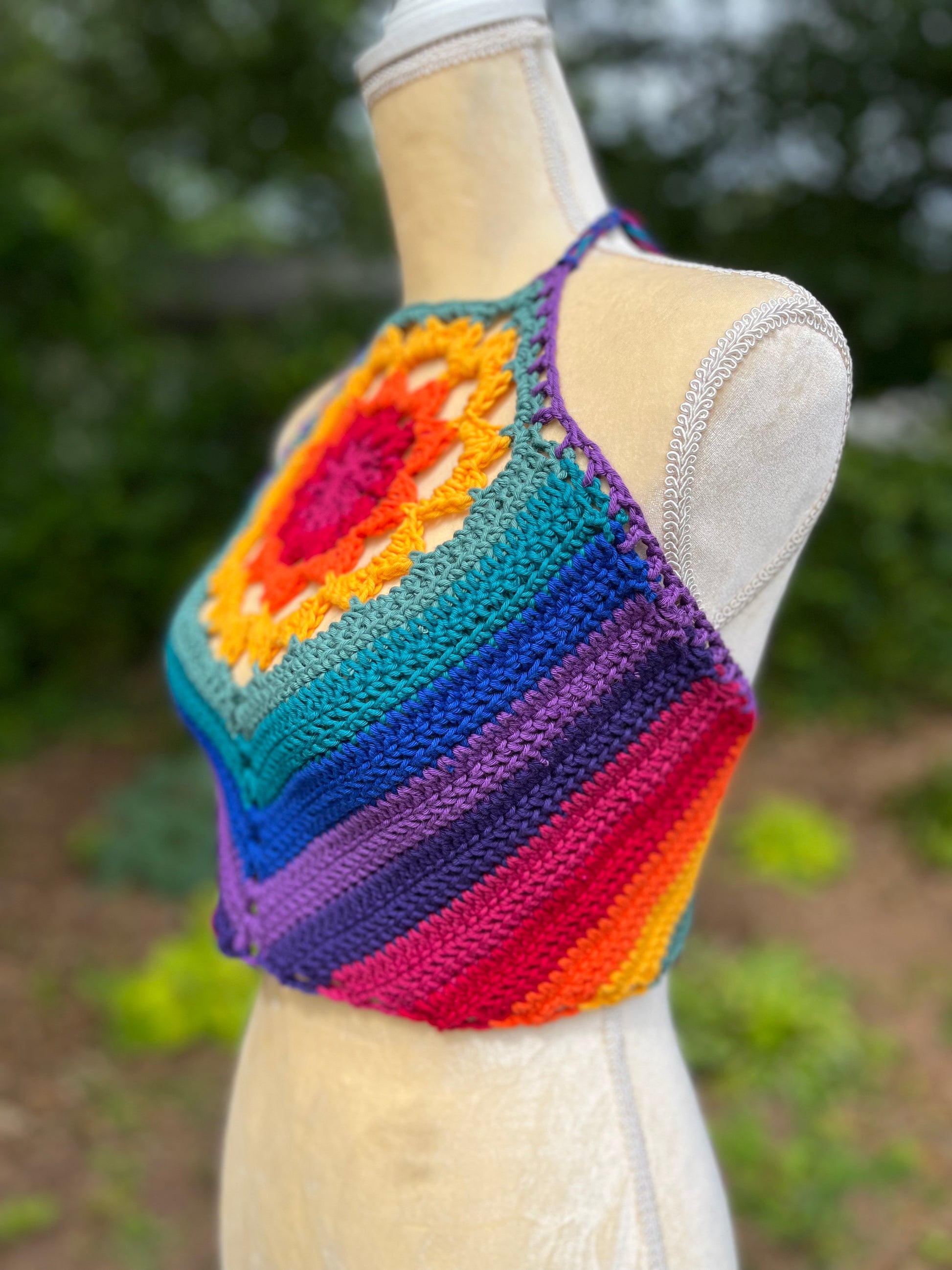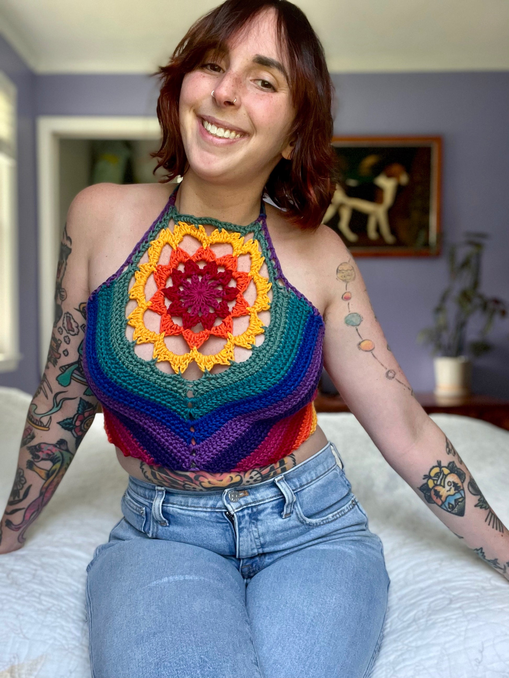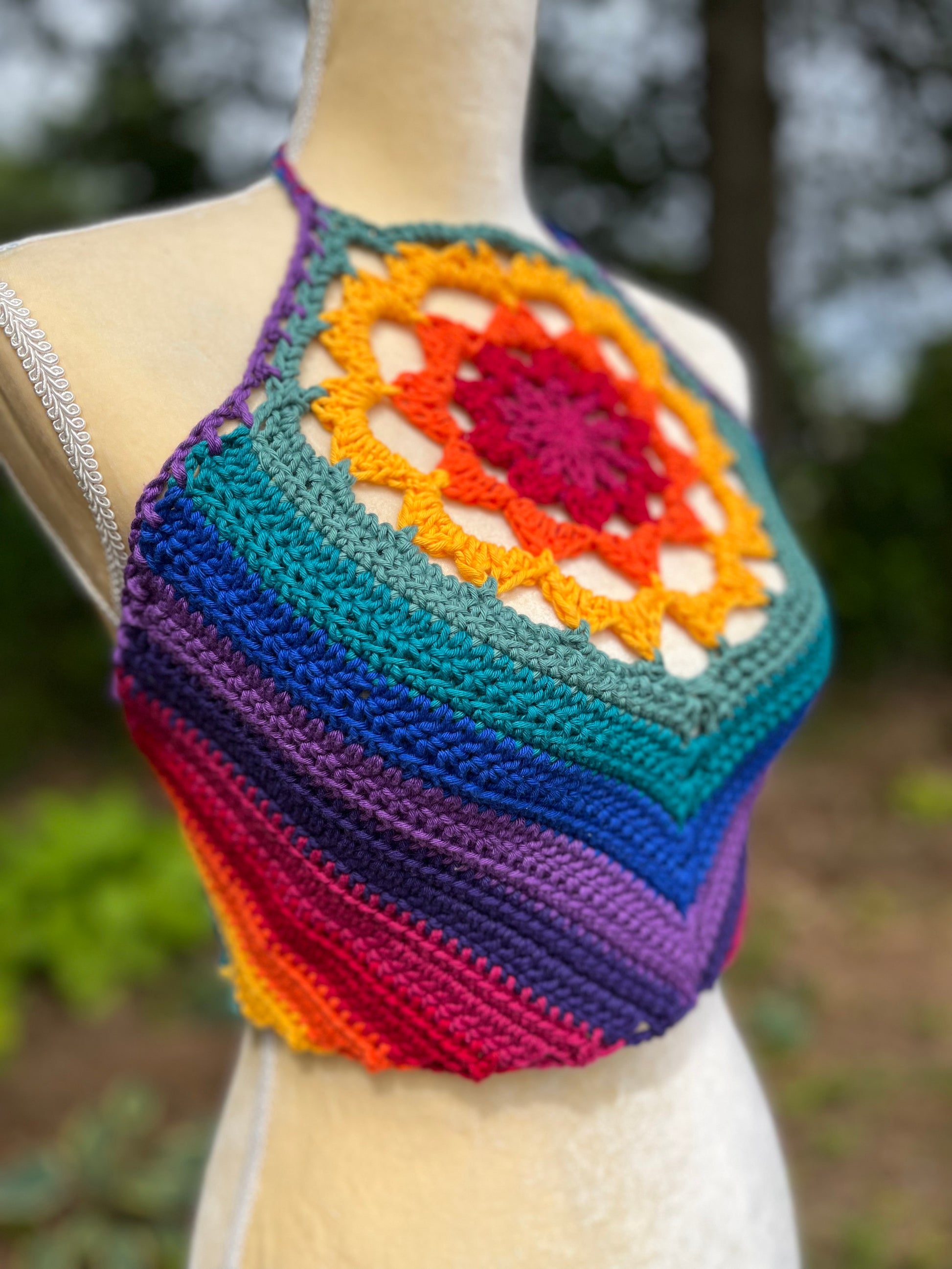 The Mandala Crop Top features a fun mandala at the center, lace up back, and an ombre rainbow pattern. It pairs great with high waisted skirts & shorts or layered under dresses