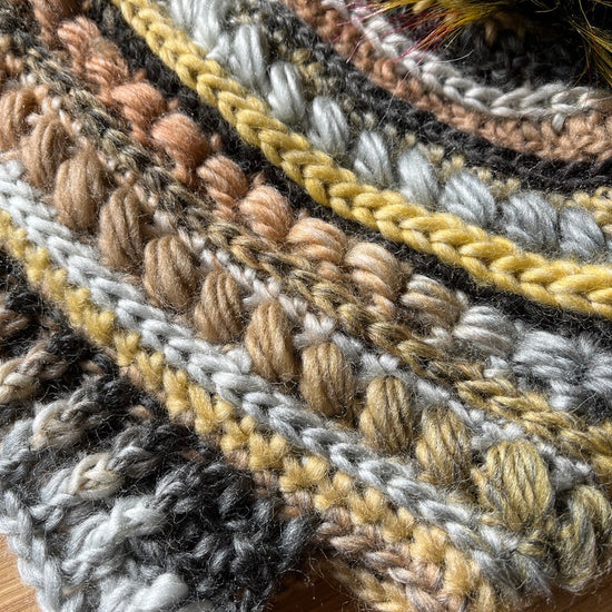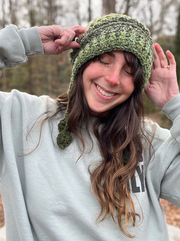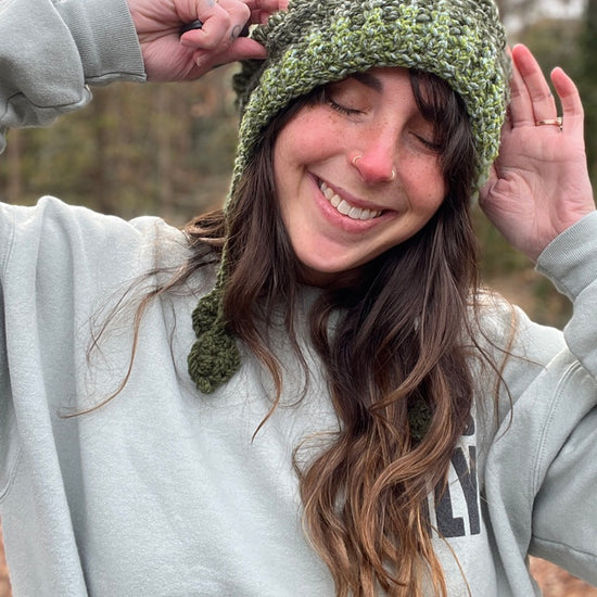 The Mashup Bonnet features rows of fun texture, a ribbed band, and funky little tassels. It has a comfortable fit and looks so cute stitched up with self striping yarn! The hat has 3 different options for tassel styles - leaves, moons, or stars so you can pick whichever one suits the vibe!