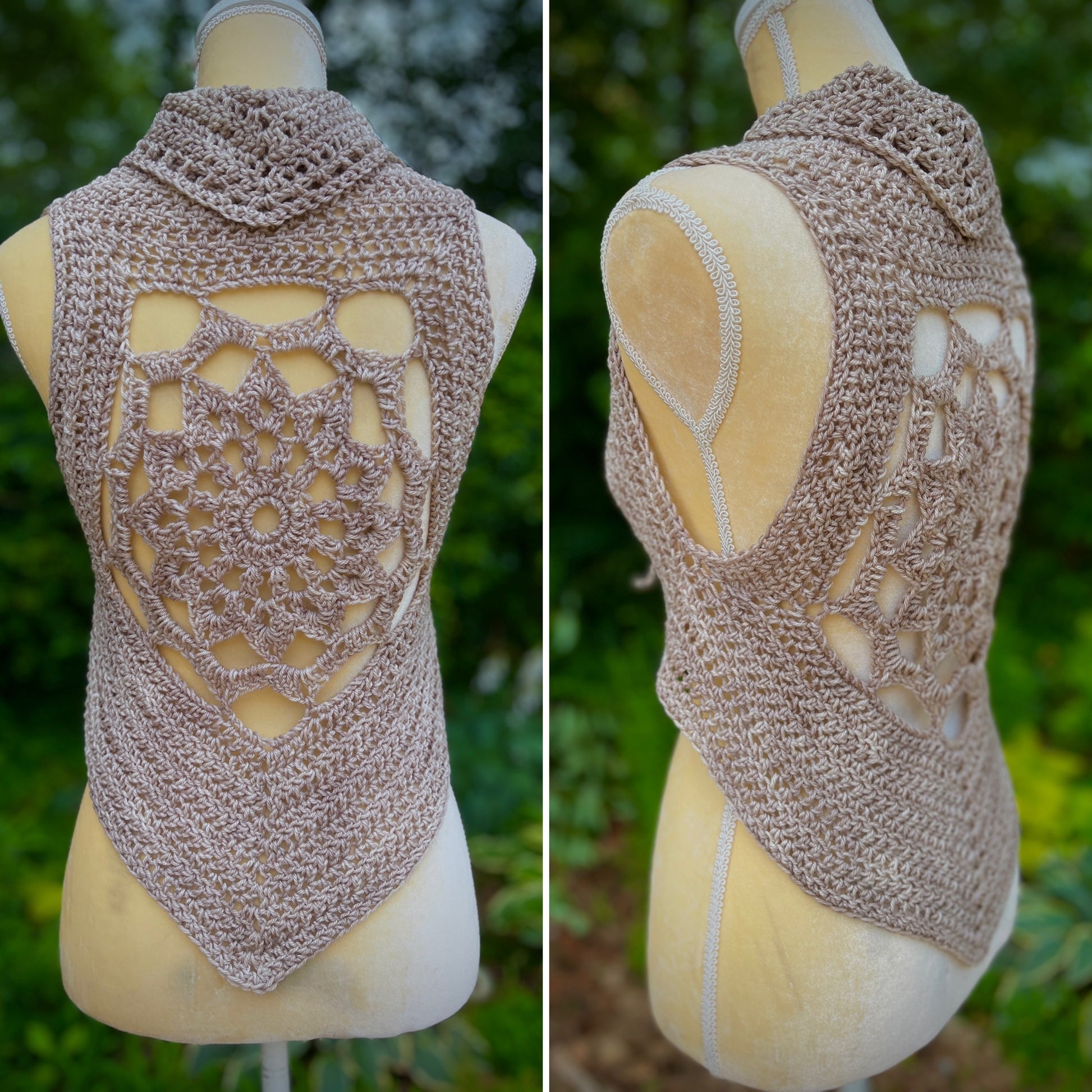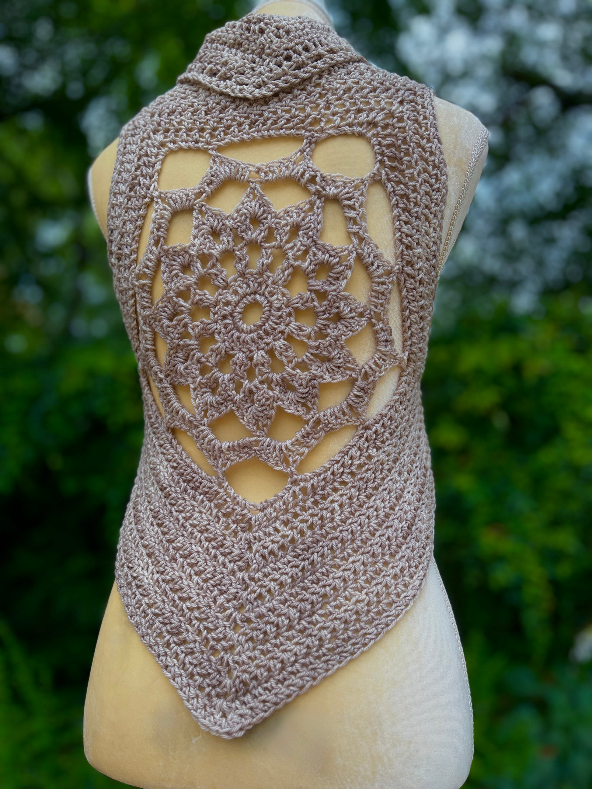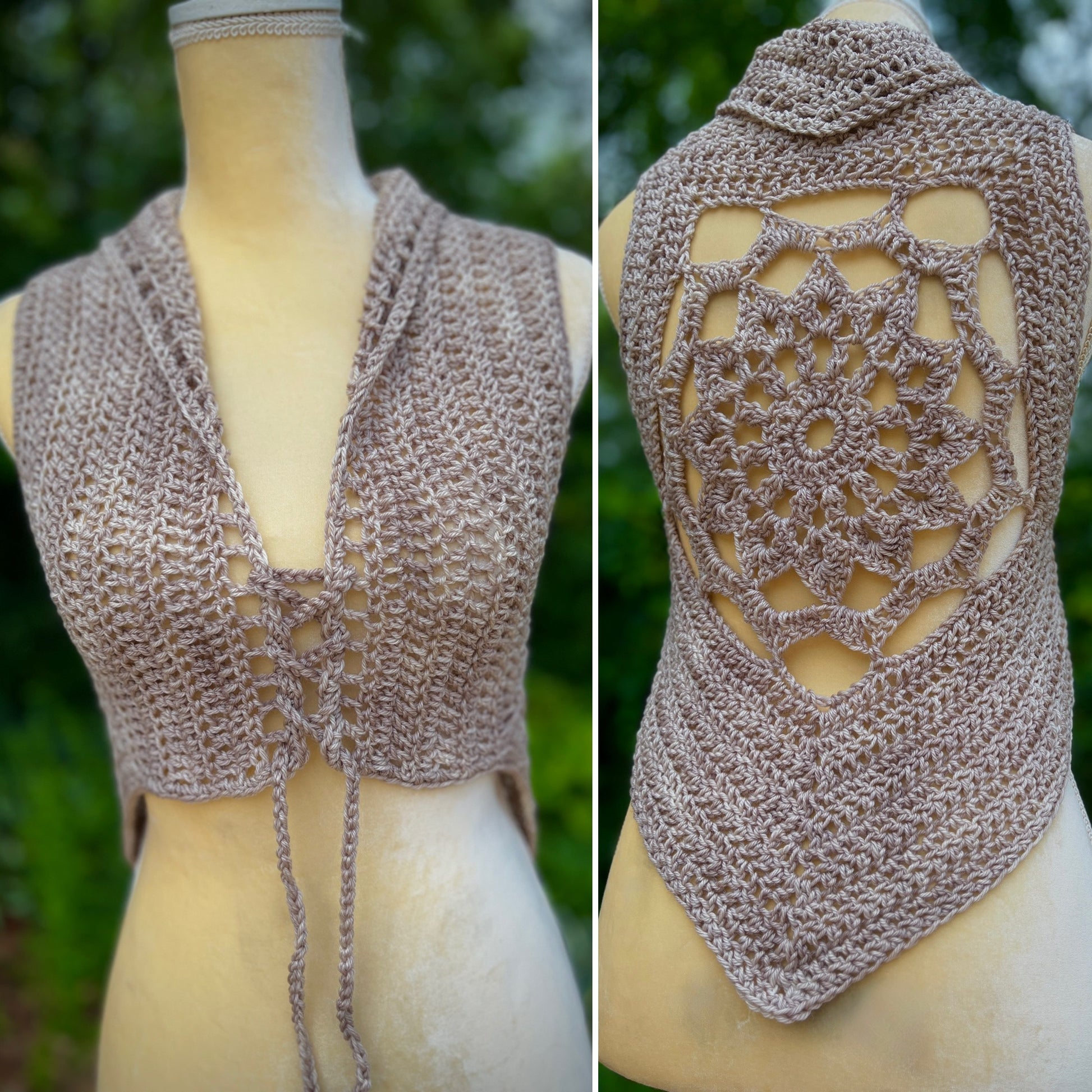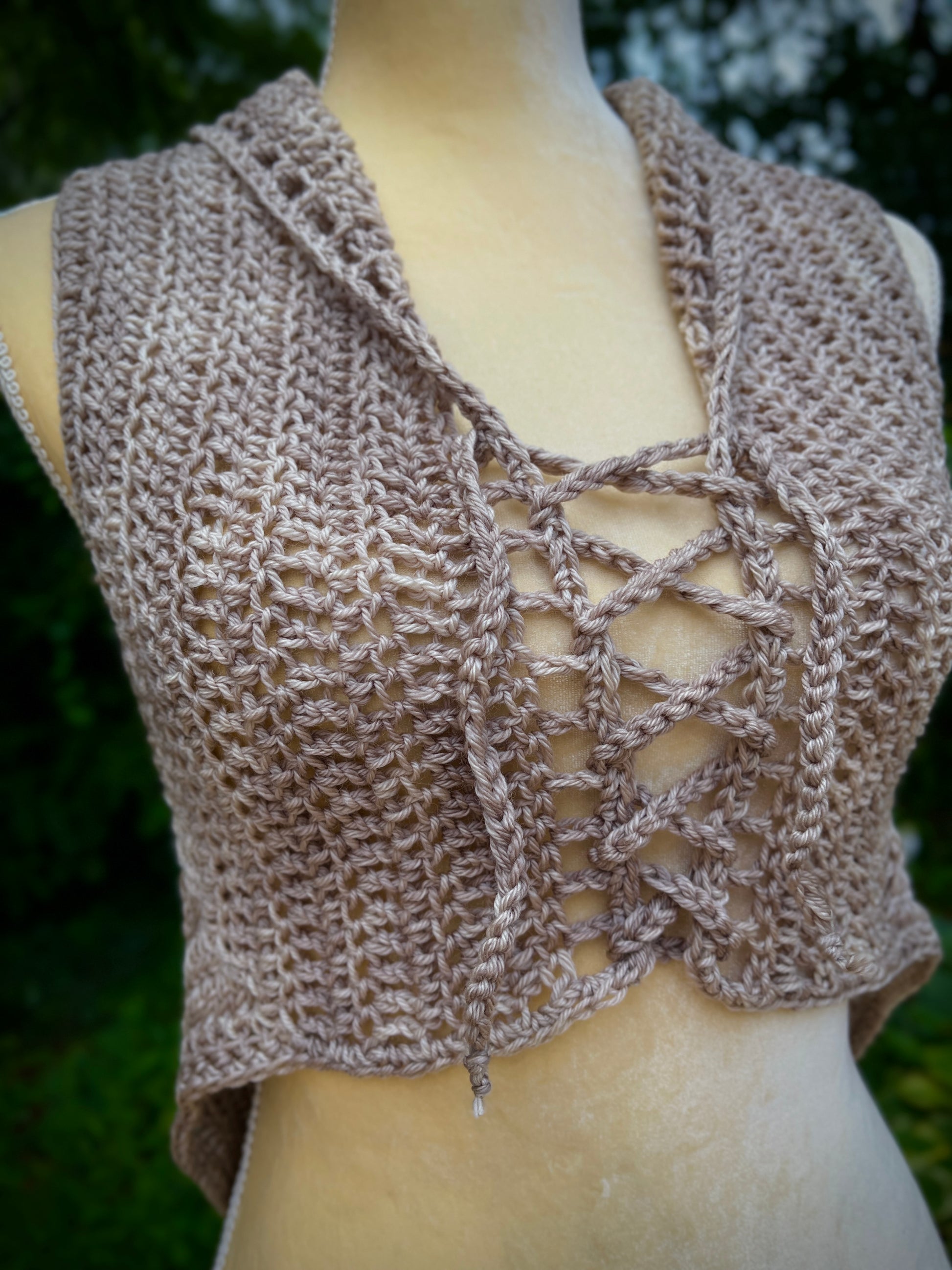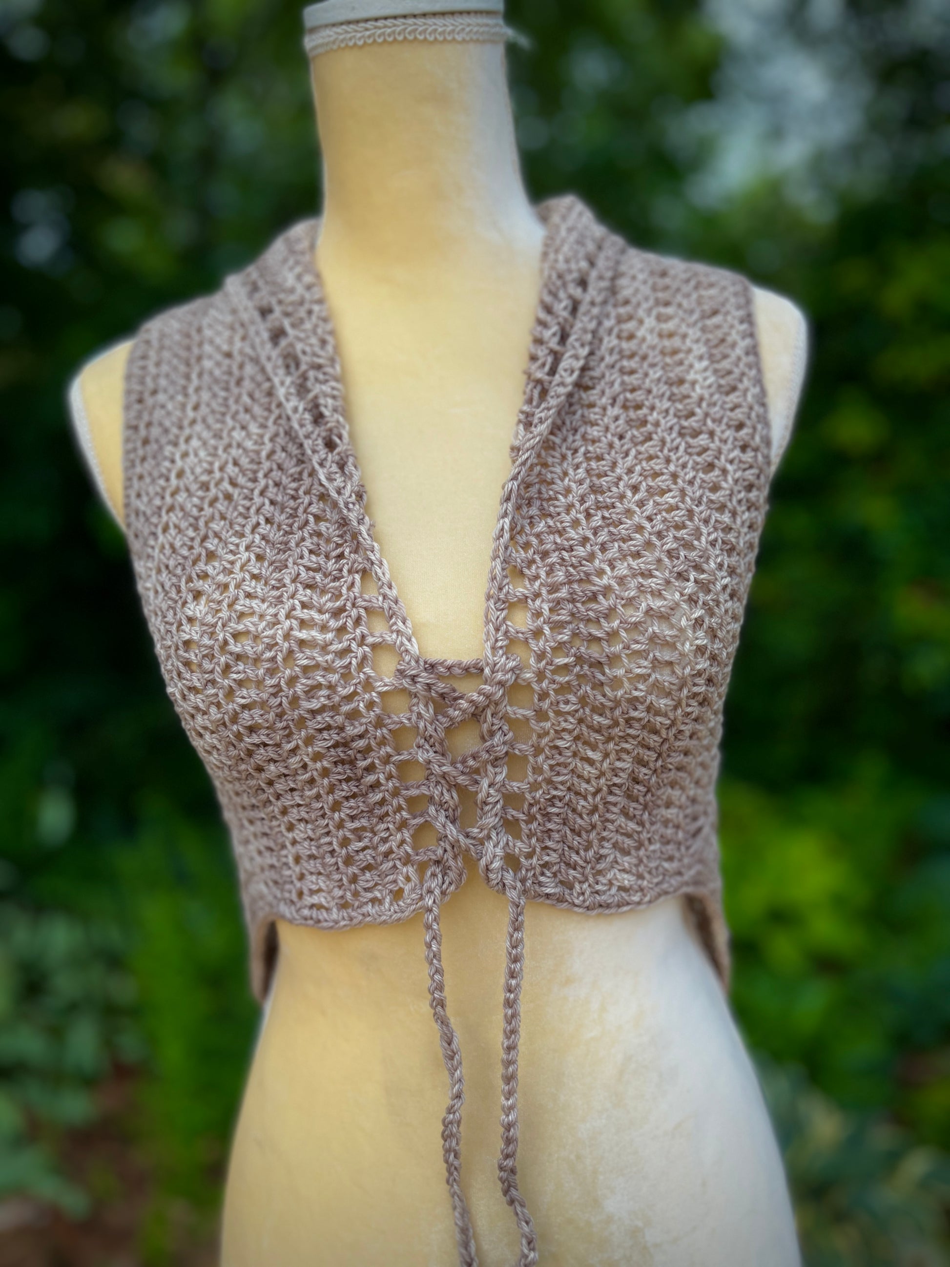 This Free Spirit Vest was stitched up in a hand dyed merino wool yarn and features pixie point edging and a lace up front