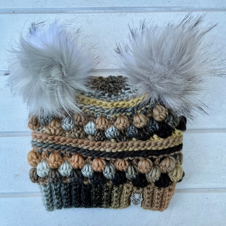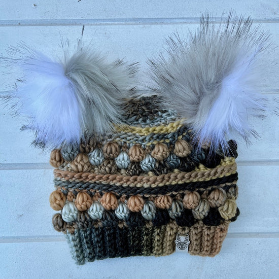 The Wobble Bobble Beanie features funky textured stitching and is topped with fluffy faux fur pompoms. Each of my hats is one of a kind