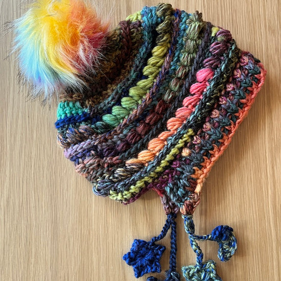 Please note: you will be receiving the rainbow hat pictured. The other pics are meant to show the fit. The hat you will be receiving has the star & moon tassels