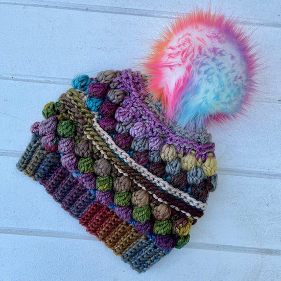 The Wobble Bobble Beanie features funky textured stitching and is topped with fluffy faux fur pompoms. Each of my hats is one of a kind