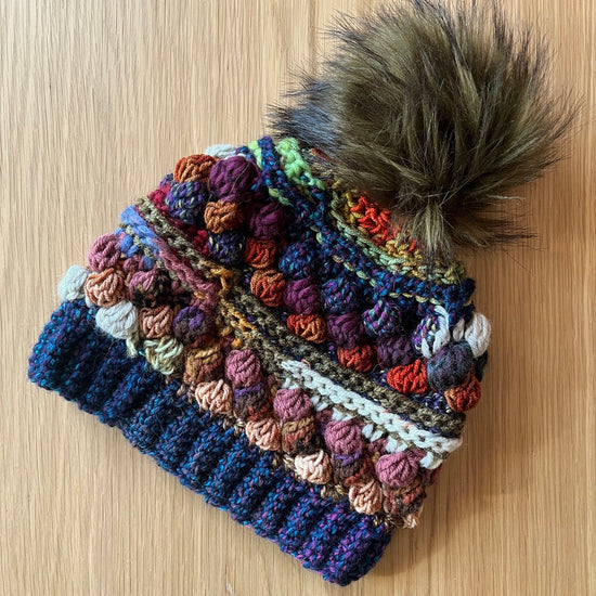 The Wobble Bobble Beanie features funky textured stitching and is topped with fluffy faux fur pompoms. Each of my hats is one of a kind