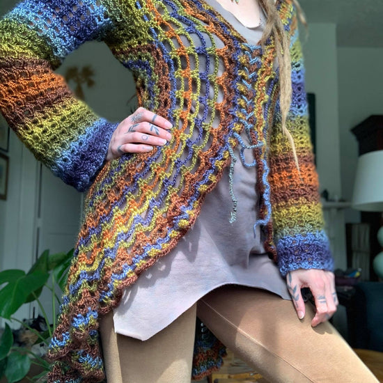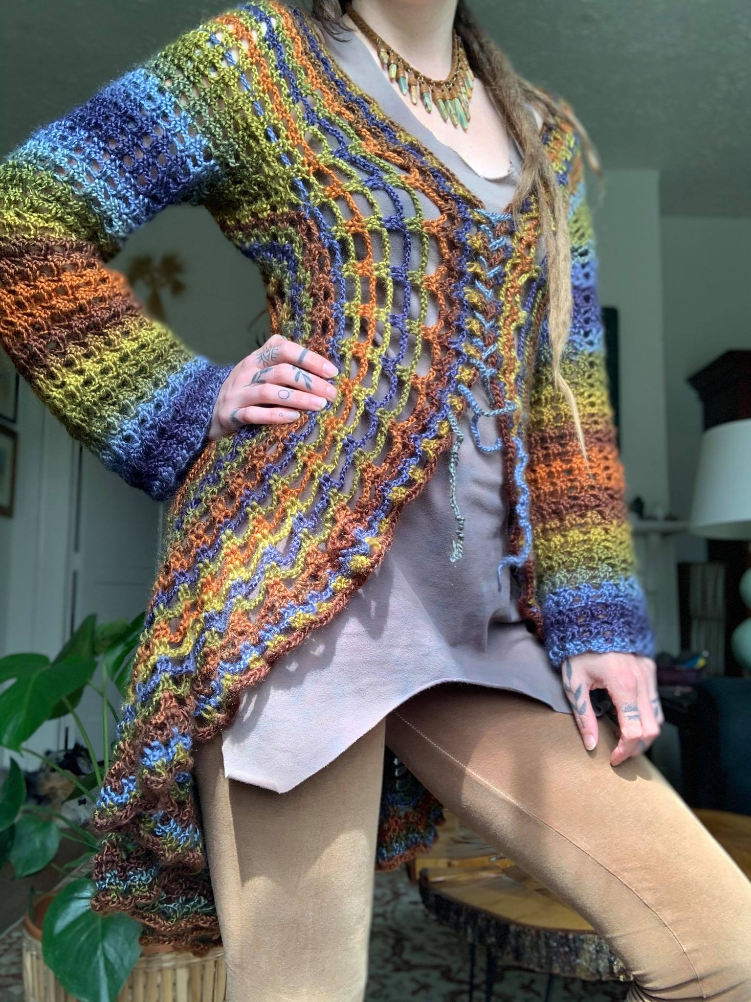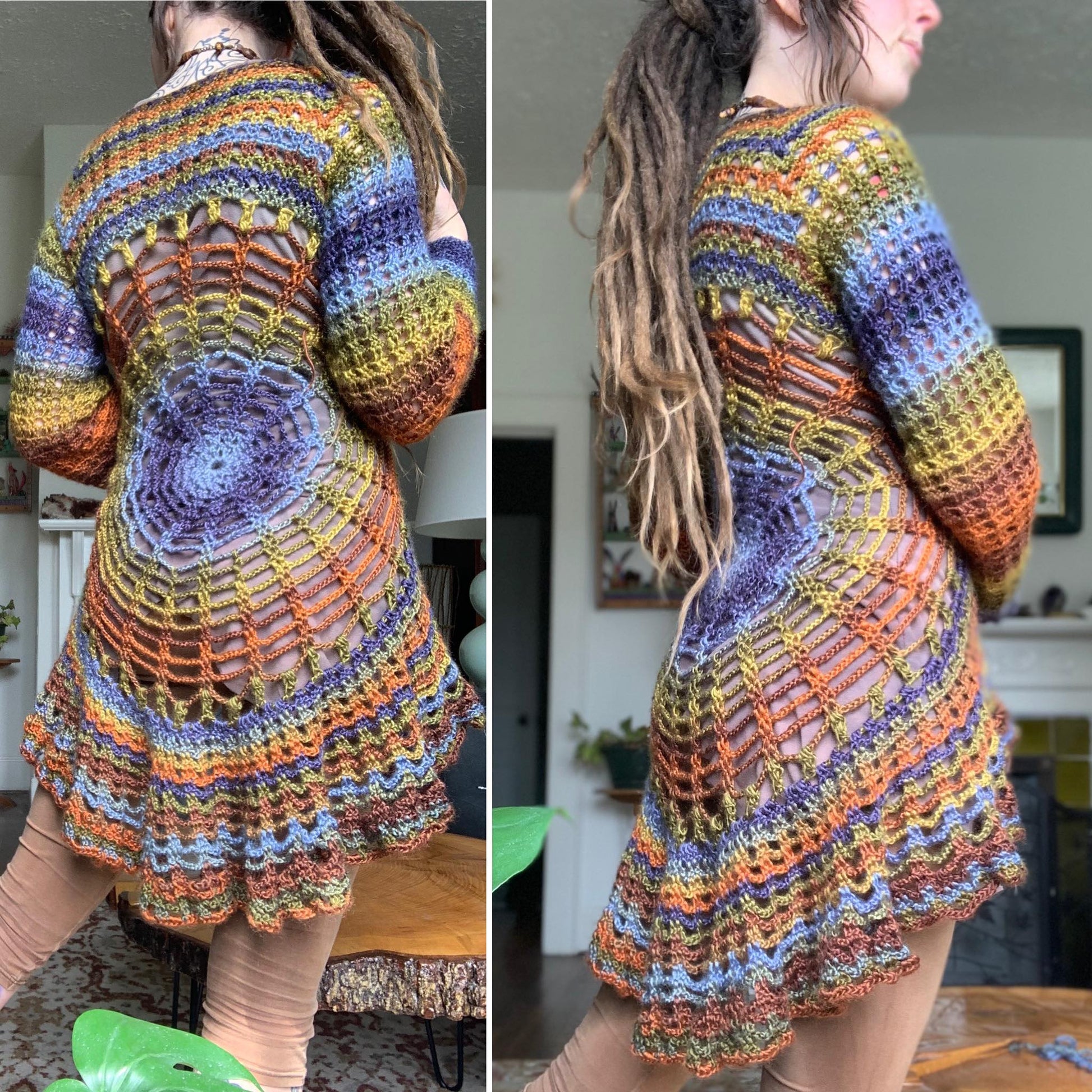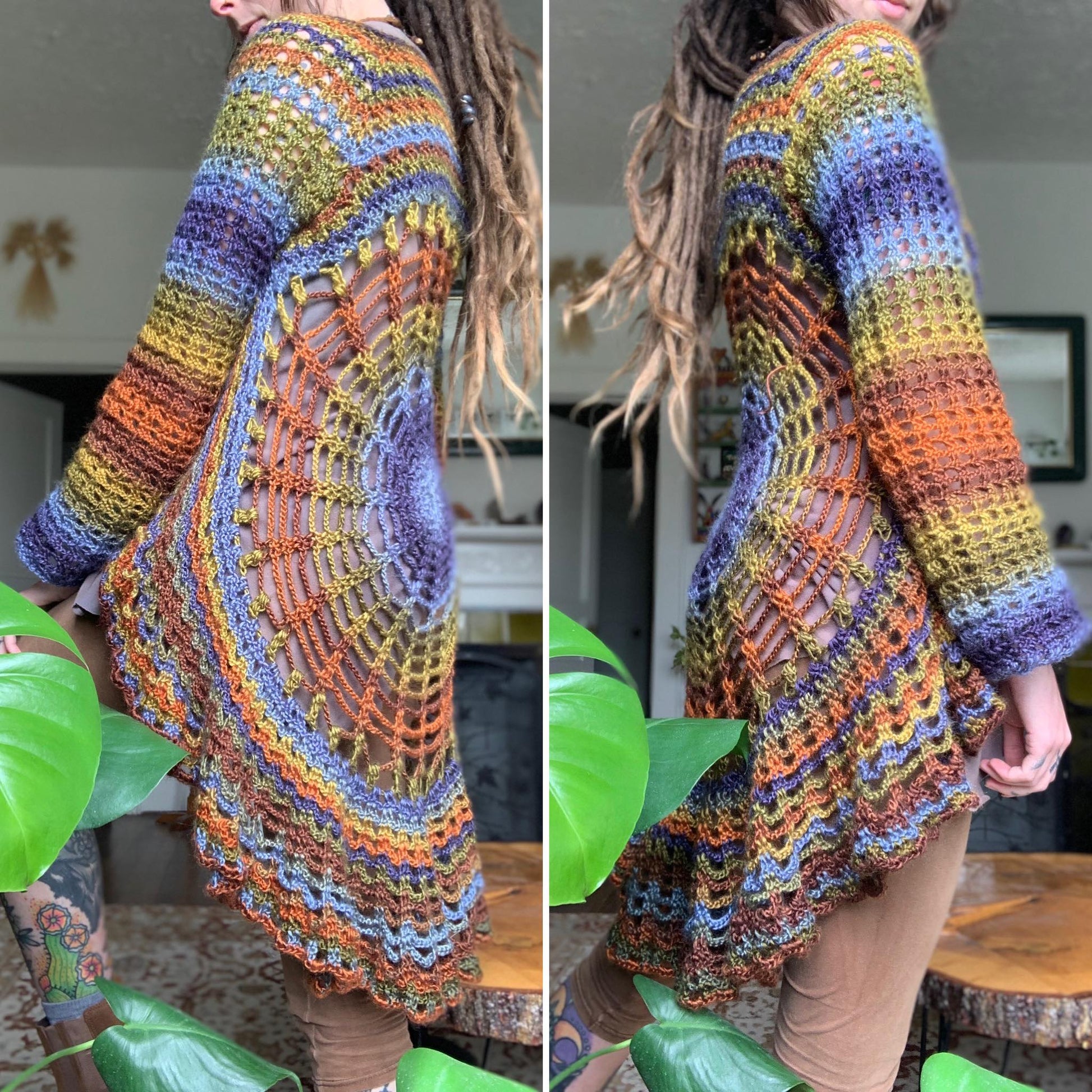 It features an openwork spiderweb back, a flutter hem, lace up front, and long comfy sleeves. This style of sweater is very stretchy, so the sizing is very forgiving. It looks great layered over dresses, with jeans, and just about anything!