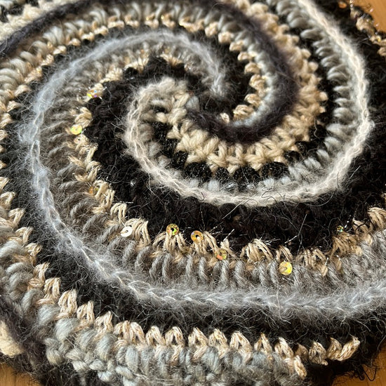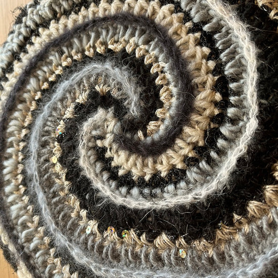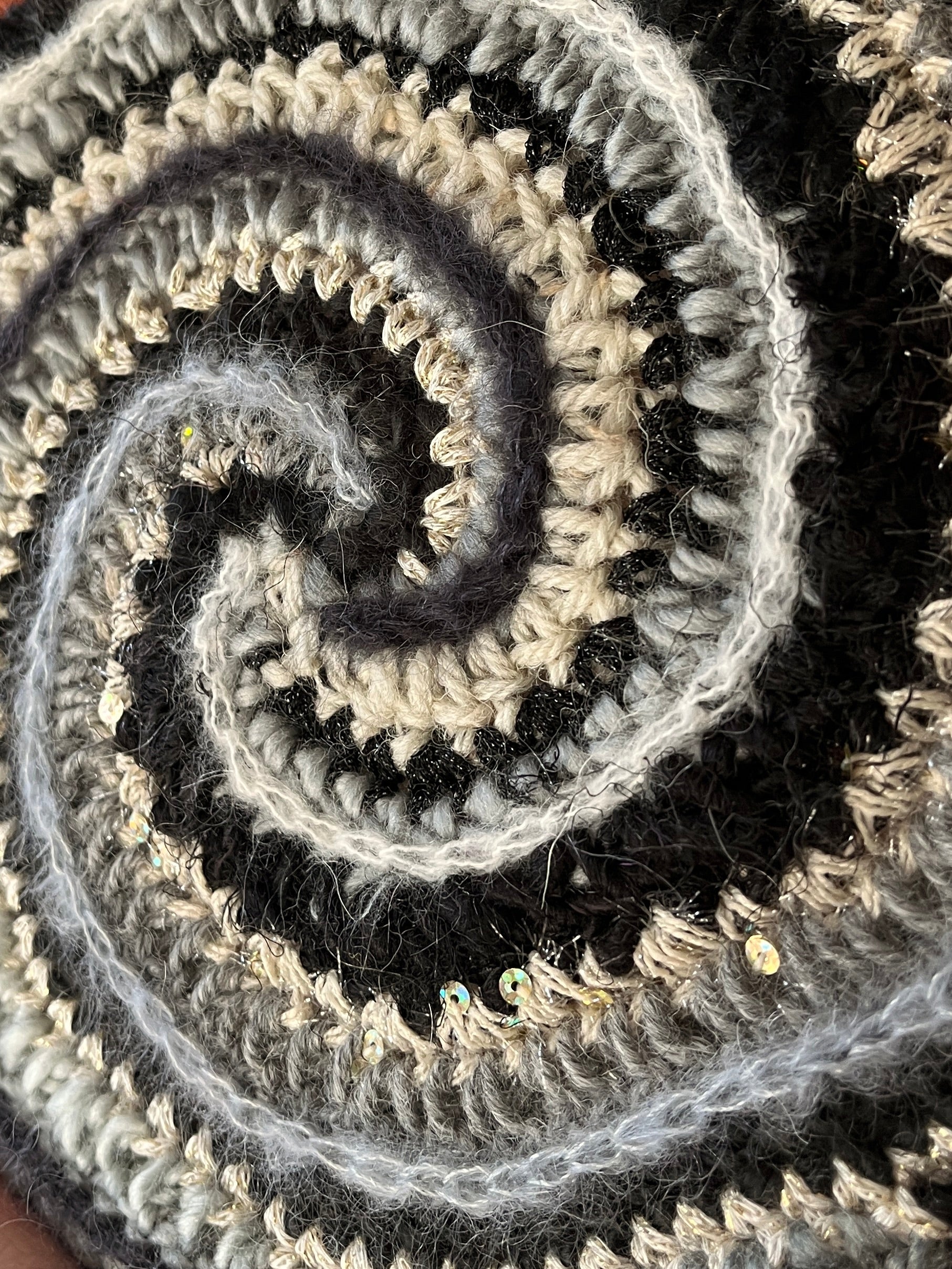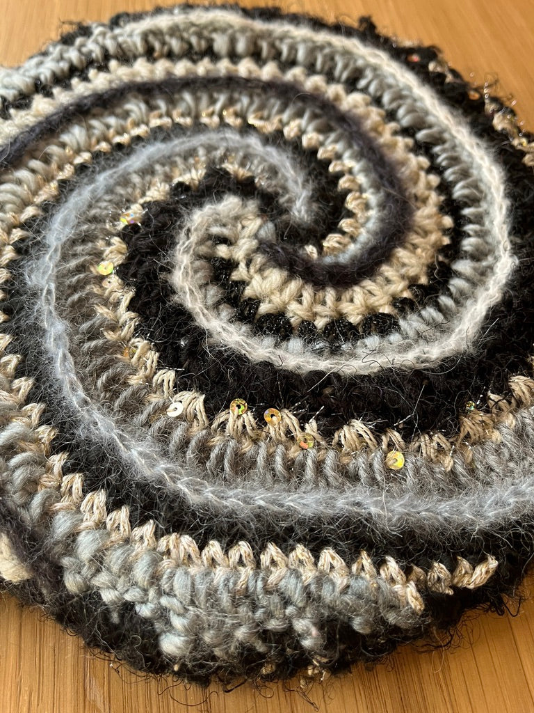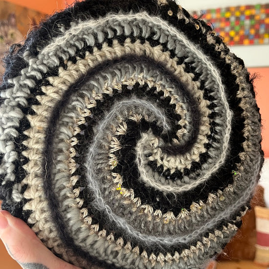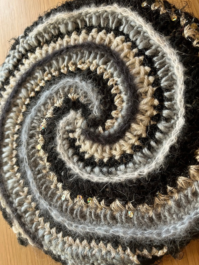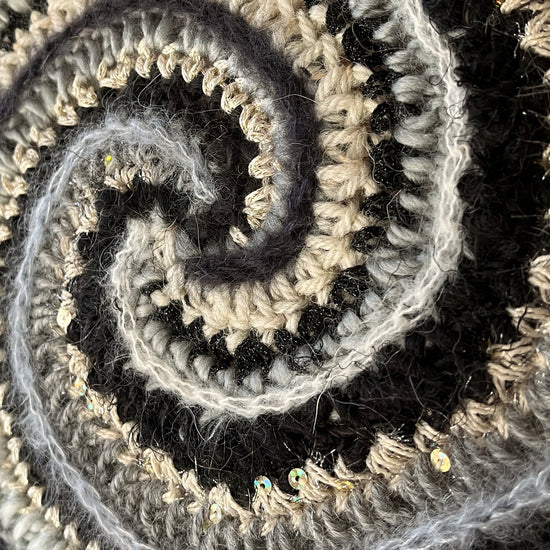 Lately I've been experimenting with adding crochet to canvases to make fiber art home decor! This was a fun one. It is a 12 color spiral with lots of highly textured yarns with sparkle & flair but in a monochromatic color scheme.