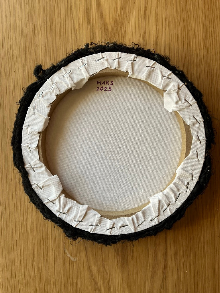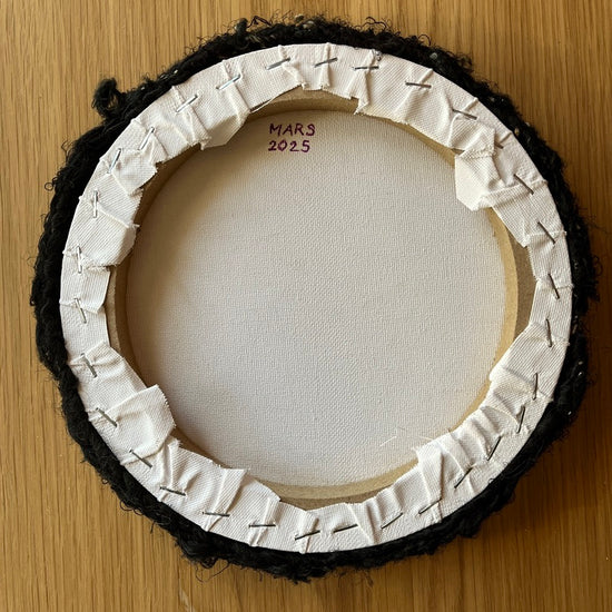 It has a bit of everything - sari silk, mohair, wool, sequined synthetic yarn, lurex, etc. It's a perfect little piece to add to a gallery wall