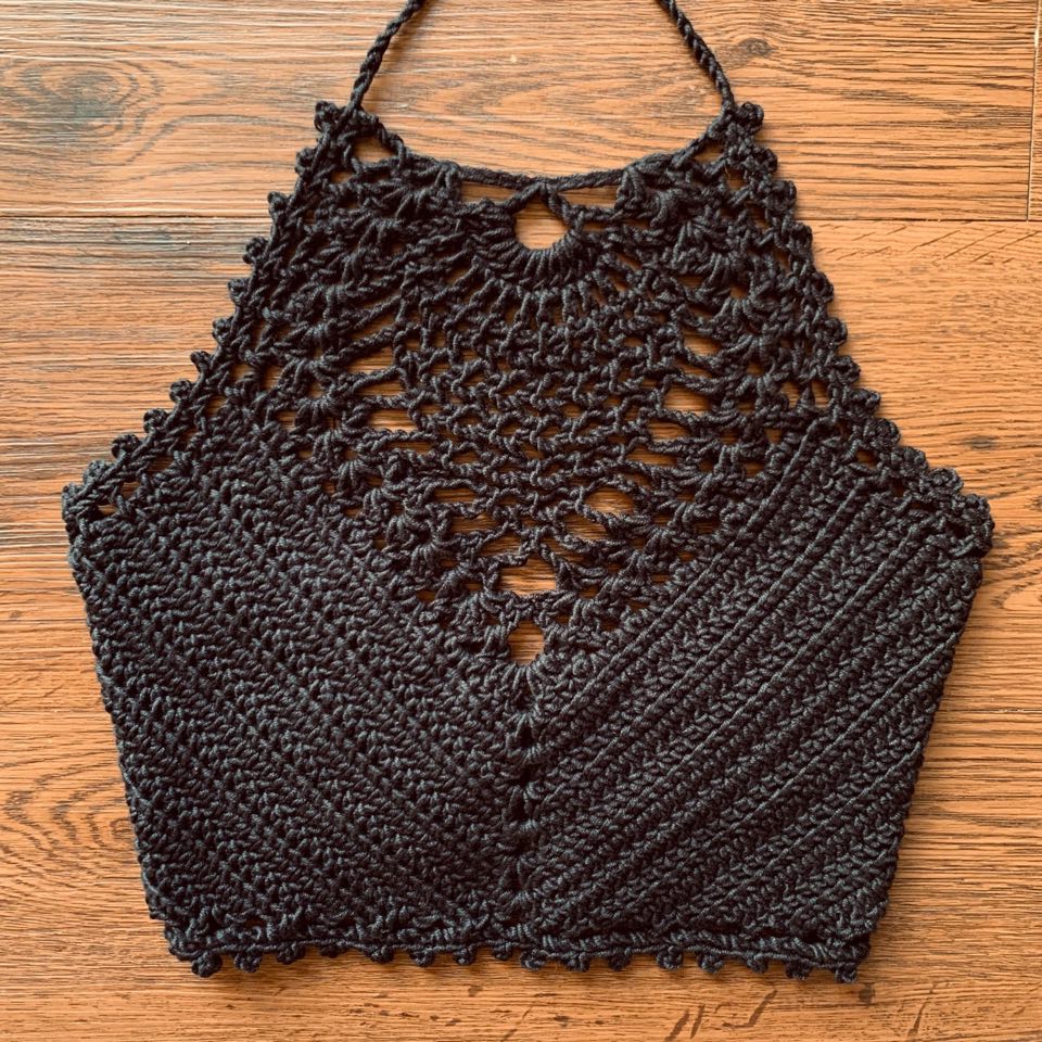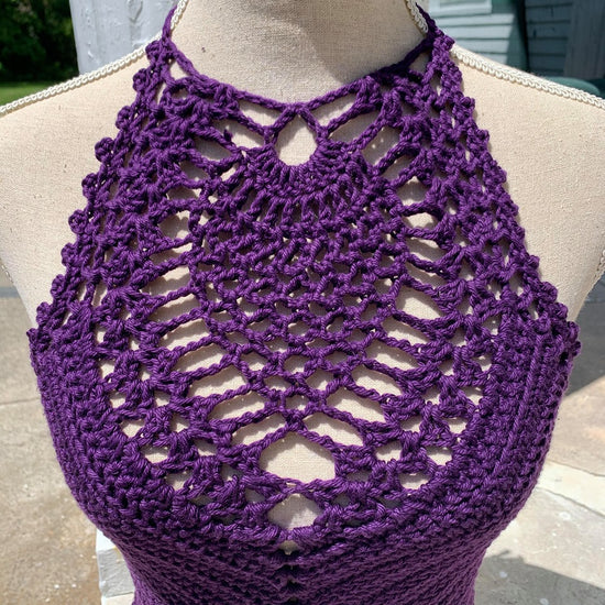 The Stella Crop Top features a large lacy pineapple motif at the neckline, cropped fit, and a delicate picot edging. It ties at the neck using halter ties and laces up the back using a separate crocheted cord. The top is made using linked double crochet stitches, which creates a very solid fabric to ensure there are no peek-a-boos.